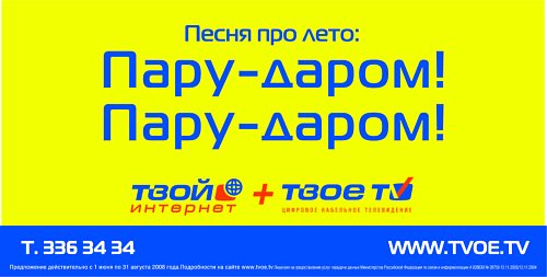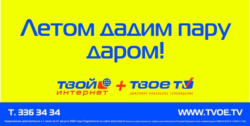 ТКТ даст пару даромАгентство «Небо» разработало рекламную кампанию в поддержку акции «Твой Интернет + Твое ТV. Все лето бесплатно!» для «Телекомпании Санкт-Петербургское кабельное телевидение» (ТКТ). Рекламная кампания проходит со слоганами «Летом дадим пару даром!», «Сообрази на твоих! Летом бесплатно!», «И то, и это даром все лето!» и «Пару – даром! Пару – даром!» Как рассказали AdLife.spb.ru в компании ТКТ, по условиям акции при подключении к услугам «Твой Интернет + Твое ТV» или «Твой Интернет» на любом тарифном плане услуга все лето представляется бесплатно, причем на безлимитном тарифном плане «Твой Интернет 1024» со скоростью 1024 кб/с. В рамках акции для всех подключившихся летом к услуге «Твой Интернет + Твое TV» абонентов в дополнение к Интернету бесплатным станет также просмотр 65 спутниковых каналов.![]() ![]() ![]() ![]() Условием участия в акции является внесение при подключении минимального авансового платежа в размере 900 рублей, которые с 1 сентября начинают списываться со счета клиента в качестве абонентной платы за изначально выбранный им тарифный план. «Летом на рынке широкополосного доступа в Интернет и премиального телевидения традиционно наступает период затишья. Чтобы поддержать уровень продаж и стимулировать клиентов на пользование услугами в это время, мы второй год подряд предлагаем потенциальным абонентам услугу широкополосного доступа в Интернет на льготных условиях. В этом году мы задействовали и другую нашу услугу – цифровое кабельное телевидение «Твое TV». Таким образом, у клиентов появилась возможность получить сразу обе услуги и понять, есть ли заинтересованность в пользовании каждой из них. При этом «Твой Интернет» можно подключить и отдельно», - прокомментировала Елена Паснюк, директор по маркетингу ТКТ. В кампании задействована наружная реклама и реклама на телевидении. Кроме того, постеры с сообщением об акции развешены в вузах. adlife.spb.ru |