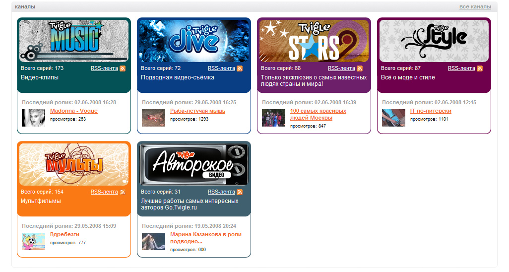 Компания Tvigle Media запускает семь новых каналовКомпания Tvigle Media запускает семь новых телеканалов: Tvigle Style, Tvigle Stars, Tvigle Music, Tvigle Dive, Tvigle "По-мужски", "Tvigle Мульты" и "Tvigle Комедия". Впервые в российском Интернете пользователю предлагается контент, сегментированный с учетом предпочтений отдельных социальных групп.Каналы будут транслировать оригинальные продукты компании Tvigle Media, такие как сериал "Маленький человек большого офиса", программу о стиле "Street Fashion", шоу "Узелки на память", видео-блоги о звездах "Biggi's Blog" и "Star Blog", а также другие продукты. Кроме того, в эфир выйдет несколько новых программ. В рамках каналов будет также показываться авторский контент. Он будет отбираться из социальной сети сайта с учетом всех требований, предъявляемых пользователями к качественному видео. |