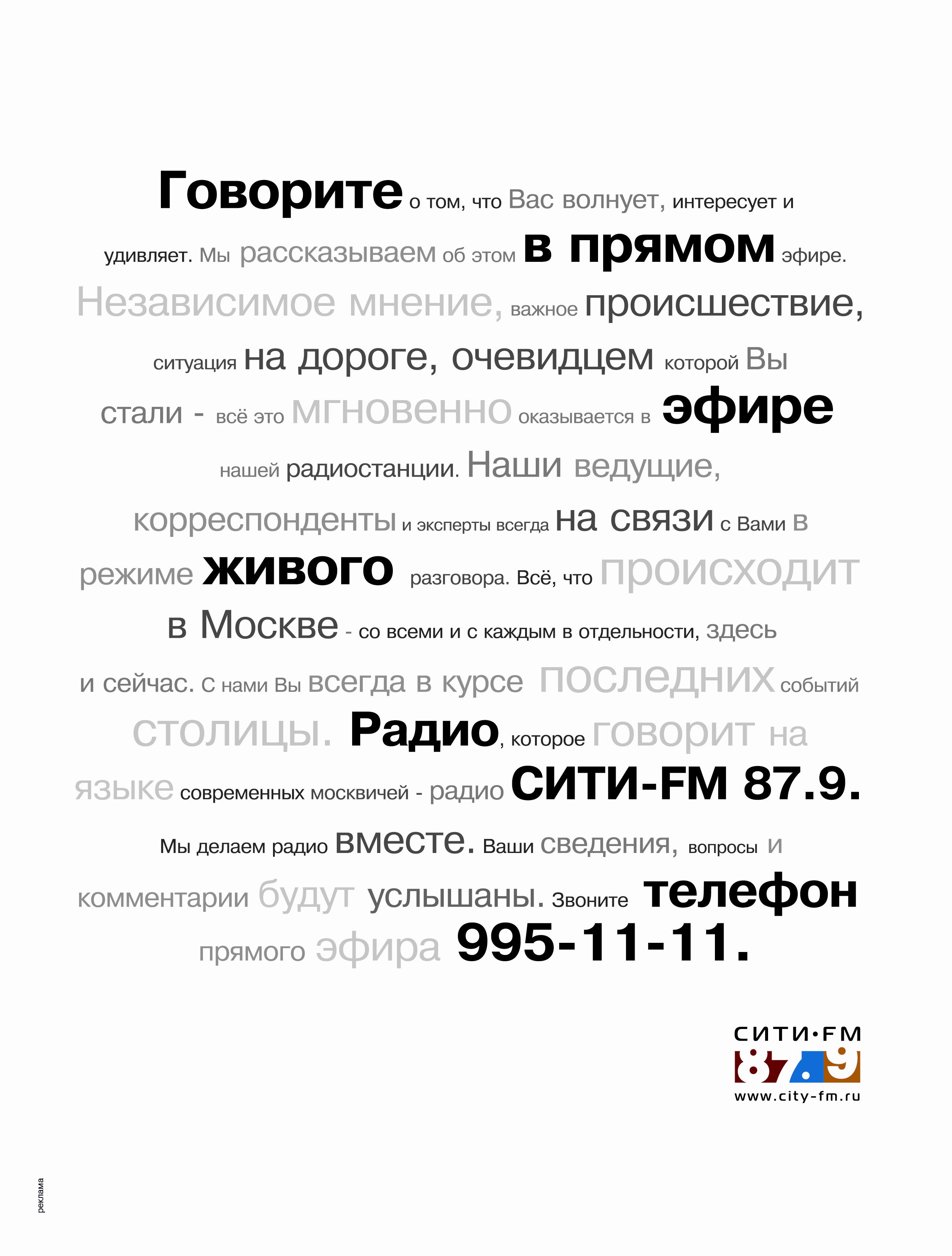 "Сити-FM" зовет слушателей в прямой эфирВ июне радиостанция "Сити-FM" решила напомнить своим слушателям телефон прямого эфира. Основной посыл новой рекламной кампании: "Сити-FM" - самая интерактивная среди московских радиостанций. Созданием макетов занималась компания Box Side.Сервисы "Сити-FM" позволяют слушателям выступать в роли внештатных корреспондентов. "Информация "из первых рук" от наших слушателей - от рядовых москвичей до членов правительства - является частью новостного потока радиостанции", - объясняют в "Сити-FM" мотивы кампании. Размещение в автомобильных изданиях обусловлено тем, что большое количество вопросов в эфире радиостанции посвящено именно автомобильному движению. Кампания будет проходить в июне. Рекламные блоки появятся в изданиях: "Автомир", "Автопанорама", "Автопилот", "Аргументы и факты", "Ведомости", "Известия", "Коммерсантъ", "Коммерсантъ Деньги", "Комсомольская правда", "Медведь", "Москвоский комсомолец", "Профиль", "Секрет Фирмы", "Финанс" и "TimeOut". |
