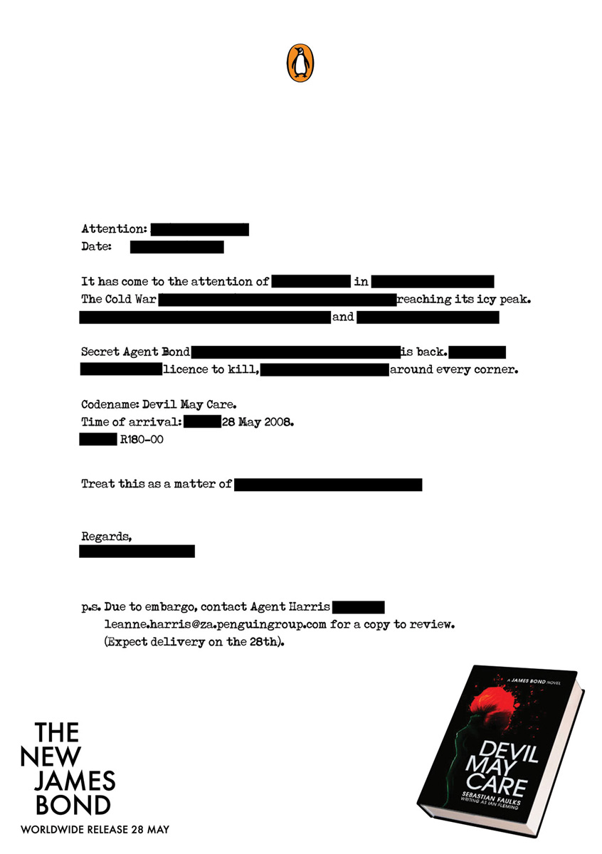 Читателя уничтожитьАгентство Urban pin-up, при помощи рекламной кампании книжного магазина Penguin, подогревает в потребителе интерес и окутывает ореолом таинственности предстоящее поступлению в продажу, которое состоится 28 мая, новой книги о легендарном агенте Джеймсе Бонде. Если вы узнаете чуть больше чем надо о предстоящем релизе, вас придется ликвидировать.Агентство: Urban pin-up, South Africa Копирайтер: Jason Kempen Арт директор: Rupert Allcock |