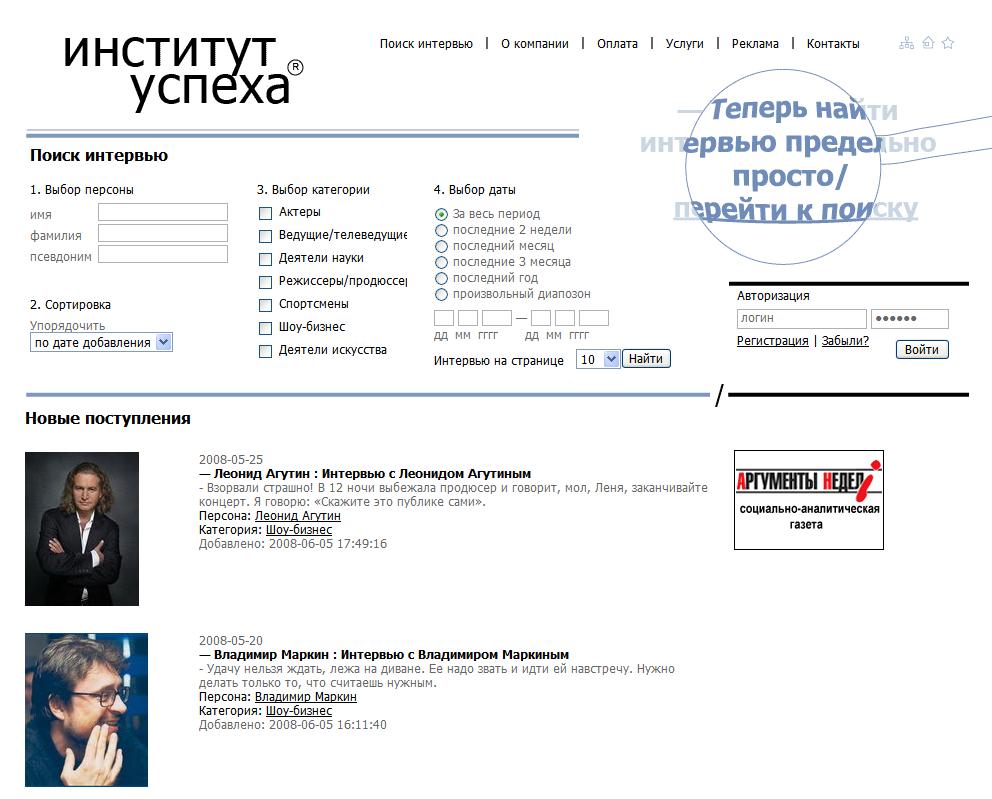 Личную жизнь актеров "продадут" через интернет. В рунете появился первый сервис платных интервью"Теперь найти интервью предельно просто", - сообщается на главной странице портала I-view.ru - первого в рунете специализированного ресурса по продаже авторских интервью. Проект реализован компанией "Институт успеха" при технической поддержке Bemobi. Любопытно, что сегмент платных журналистских материалов до сей поры оставался практически пустым.Проект предлагает пользователю оформить заказ, исходя из объемов закачек, или воспользоваться услугой заказа (текст будет подготовлен в установленные сроки), которая обойдется вдвое дороже. Разовое открытие и перекачка одного текста стоит 1500 рублей. Размещение новых текстов производится не реже двух раз в неделю. Компания "Институт успеха" гарантирует, что клонов текстов, размещенных на портале нельзя найти больше нигде. "Текст, оплаченный представителями Вашей компании, будет закрыт для других СМИ соответствующего региона", - отмечается на сайте. Основу коллектива редакции I -view.ru составляют менеджеры, журналисты и юристы, занимавшие ключевые посты в "Аргументах и фактах", "Известиях" и еженедельнике "Аргументы Недели". Как видно из рубрикатора, на портале предполагается размещение рекламы. Первый баннер "Аргументов недели" уже весит на сайте. Дмитрий Захаркин, Sostav.ru |