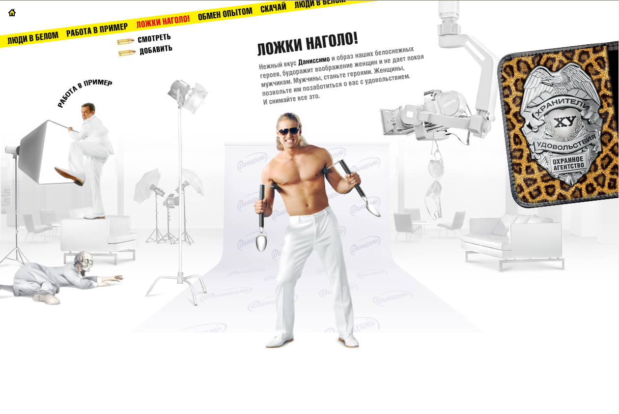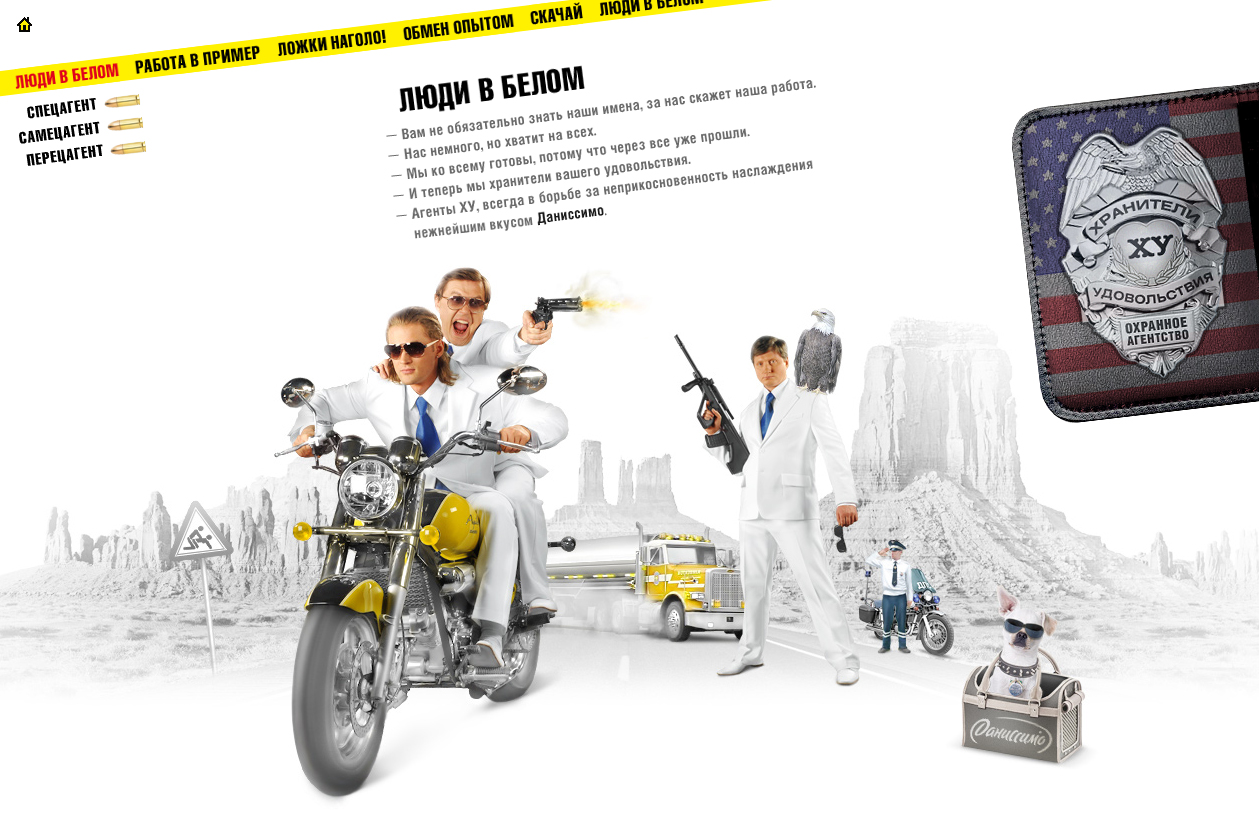 Спецагент, Самецагент и Перецагент встали на стражу DanissimoКомпания Danone запустила обширную рекламную кампанию для своего бренда Danissimo в интернете. Был создан развлекательный портал ludiXY.ru, главными героями которого стали сотрудники охранного агентства «Хранители Удовольствия» - Спецагент, Самецагент и Перецагент. Это те самые men in white, которые берегут покой поедающих творожные десерты барышень. Именно прекрасную половину человечества, известную своей тягой к десертам Danissimo избрал своей целевой аудиторией, и именно для них предназначен этот сайт.