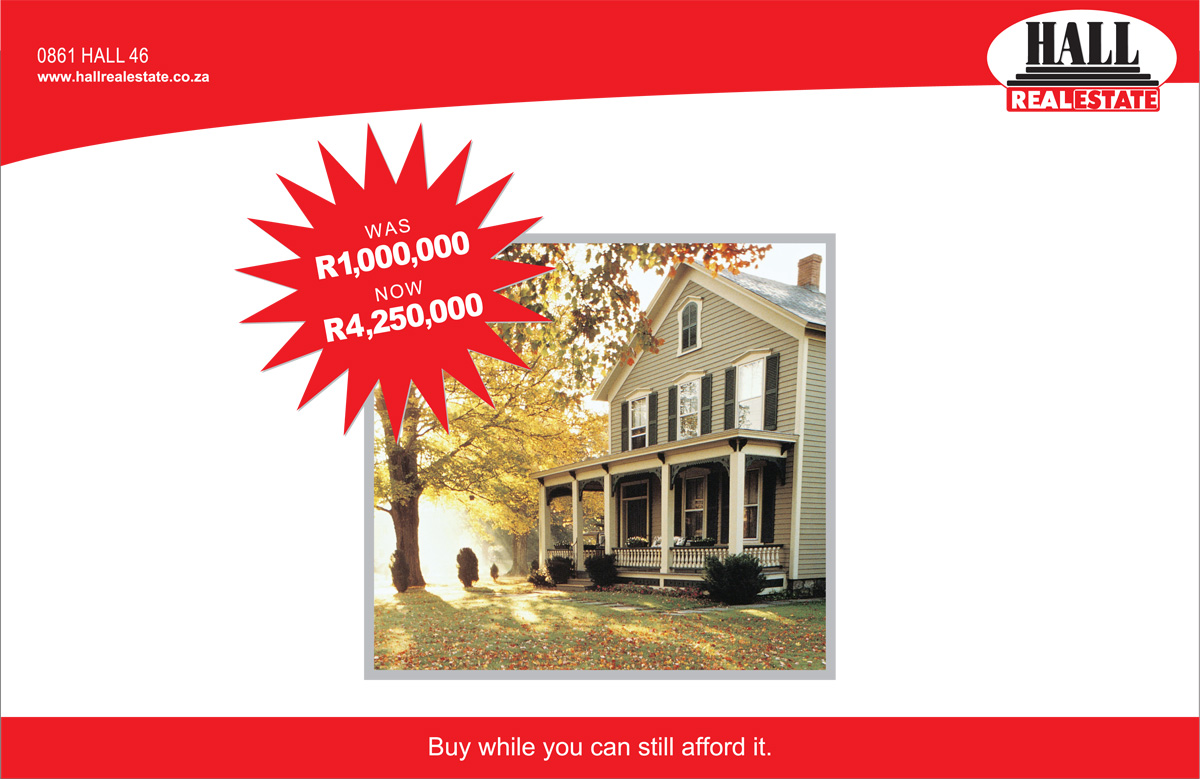 Завтра будет дорожеРаньше этот домик стол 1 000 000 южно-африканских рандов, а теперь его можно приобрести за 4 250 000 рандов. А если вы так и будете медлить с покупкой дома, то, в конечном итоге, вам вообще не хватит на него денег, так что следует как можно быстрее обратиться в агентство недвижимости Hall Real Estate.Агентство: Urban pin-up, ЮАР Копирайтер: Jason Kempen Арт-директор: Rupert Allcock |