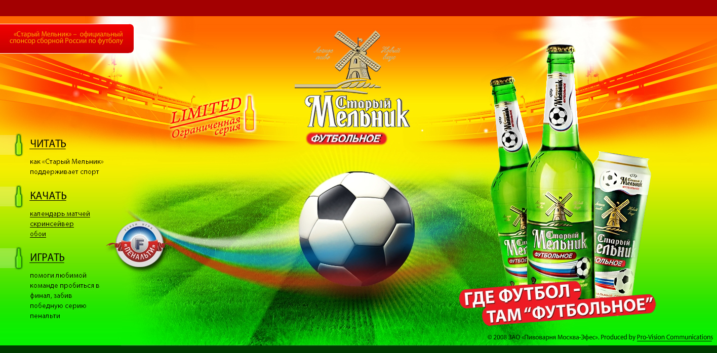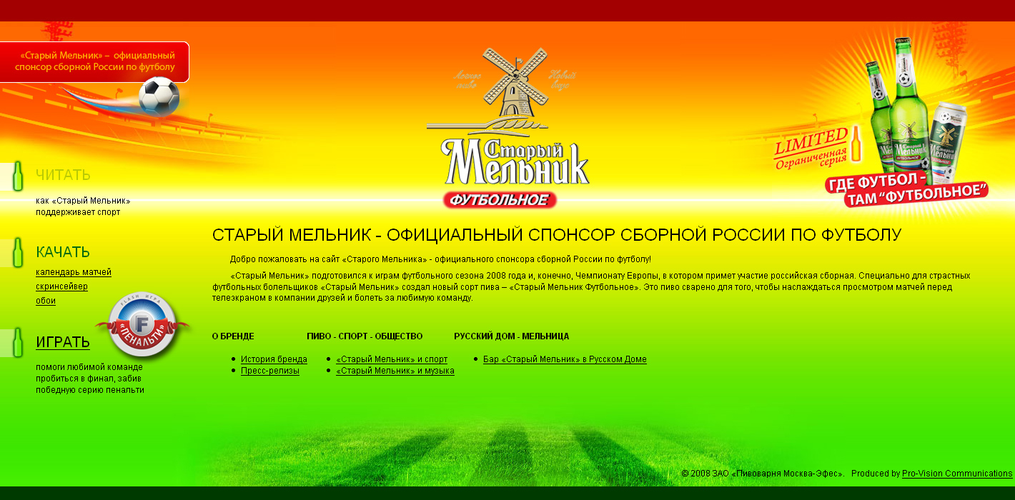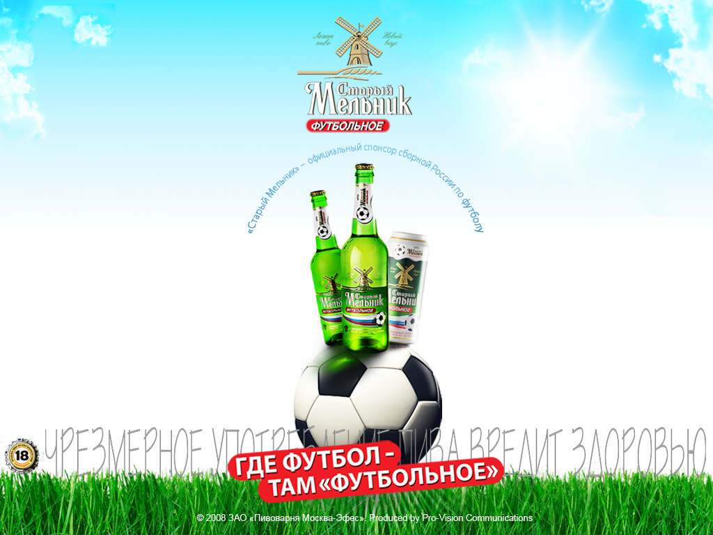 «Старый Мельник» запускает интернет-ресурс, посвященный Евро-2008 и своему пивуБренд «Старый Мельник», официальный спонсор футбольной сборной России, запускает web-сайт www.starymelnik.ru, посвященный футболу и пиву «Старый Мельник». Посетители ресурса смогут узнать больше о бренде «Старый Мельник», его работе с Российским футбольным союзом (РФС) и поддержке национальной сборной. На сайте «Старого Мельника» размещены материалы для свободного скачивания, а также интерактивная flash-игра «Пенальти». Новый интернет-ресурс бренда «Старый Мельник» начинает работу накануне самых важных игр футбольного сезона 2008 года и, конечно, Чемпионата Европы ЕВРО-2008, в котором примет участие российская сборная. Сайт создан на основе flash-технологий, его дизайн выполнен в «футбольной» стилистике. Материалы сайта размещены в трех основных разделах ресурса: «Читать», «Качать», «Играть» – доступ к которым осуществляется с главной страницы. Раздел «Читать», призван познакомить гостей сайта с брендом «Старый Мельник». Здесь собраны материалы о «Старом Мельнике», его истории, поддержке брендом спортивных и музыкальных мероприятий. Также здесь они могут посмотреть информацию о «Евро 2008».В разделе «Качать» размещены материалы для бесплатного скачивания. Специально для «телевизионных» болельщиков «Старый Мельник» подготовил календарь матчей группового этапа ЕВРО-2008, в формате PDF. В этом же разделе пользователи смогут скачать скринсейвер и обои для рабочего стола, выполненные в «футбольном» дизайне. В разделе «Играть», соответственно, находится flash-game «Пенальти», в которой пользователям предлагается в серии пенальти реализовать потенциальные возможности всех команд, которые будут сражаться за кубок «Евро-2008». Месяц назад бренд отметил приближение игр, выпустив на период проведения Чемпионата новый сорт пива «Старый Мельник Футбольное» . |