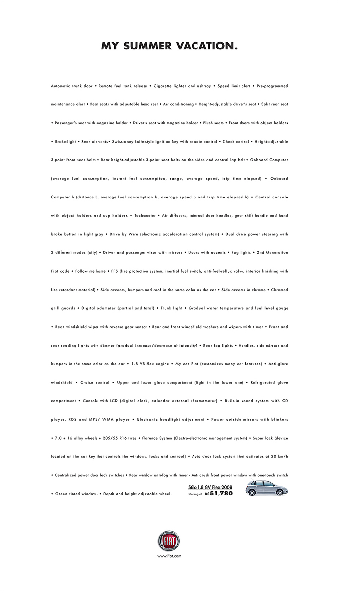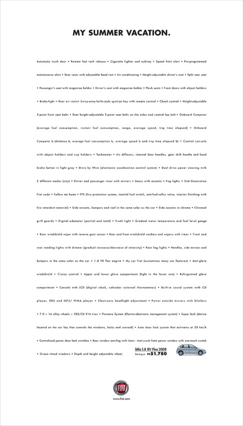 Fiat - лучше, чем отпускАгентство из Бразилии Giovanni + DraftFcb при помощи рекламной кампании Fiat показывает, что автомобиль этой марки содержит в себе все самые последние достижение автопрома. Единственное о чем вы будете думать, когда будете писать о том, как вы провели отпуск - это Fiat.Агентство: Giovanni + DraftFcb, S?o Paulo, Brazil Кретивный директор: Adilson Xavier, Ricardo John, Sidney Ara?jo Арт директор: Darcio Estaliano Копирайтеры: David Romanetto, Ricardo John |