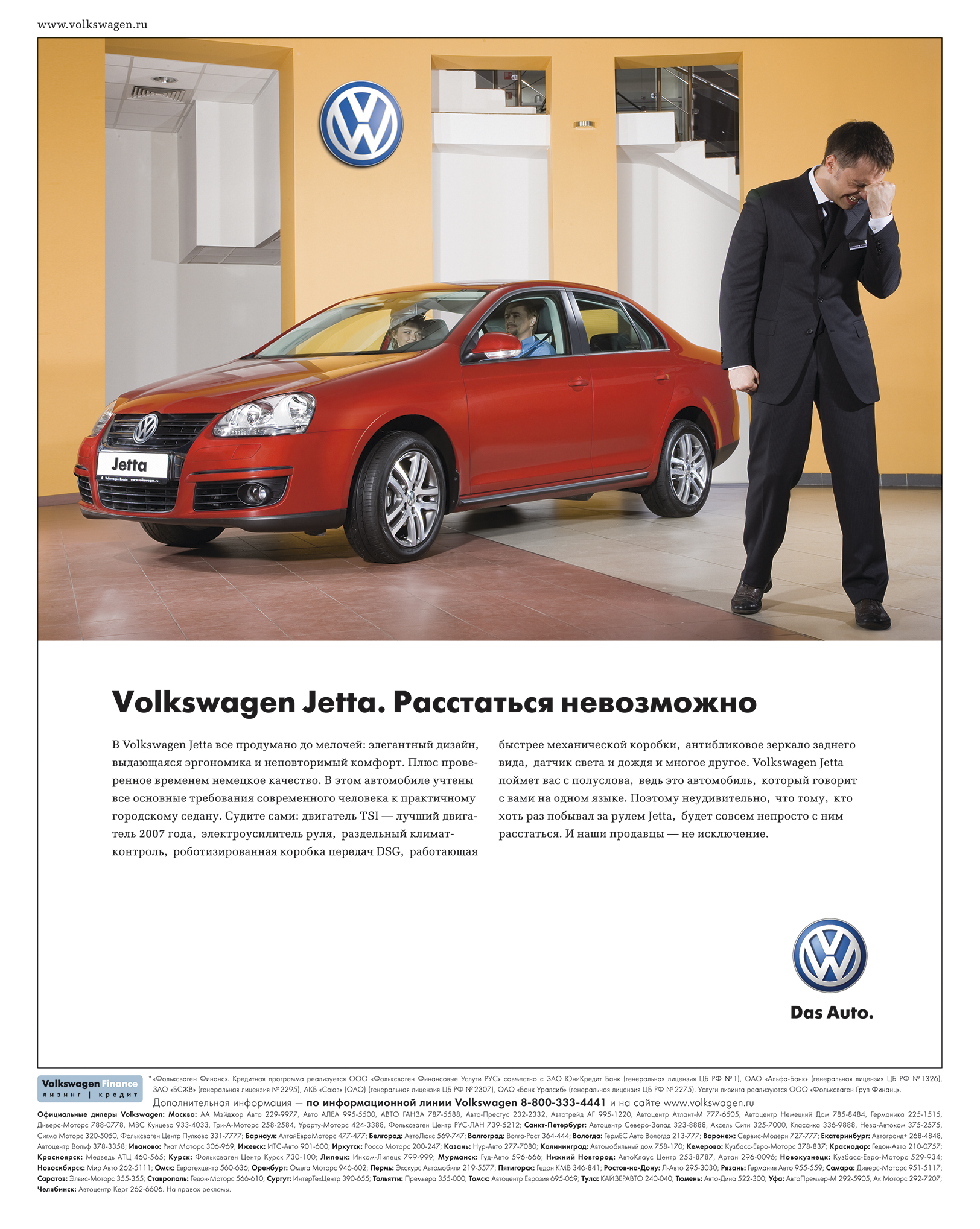 DDB заставляет менеджеров страдать. Кампания для "Фольксваген Джетта"Новая работа агентства DDB - кампания Фольксваген Джетта.Основная идея ролика и печатной рекламы проста: Джетта - это не просто автомобиль. Это уникальное сочетание технических инноваций. Это автомобиль, в который можно по-настоящему влюбиться. Джетта настолько совершенна, что даже продавцу не так-то просто с ней расстаться. Состав творческой группы Фольксваген: Директор по маркетингу: Даниил Проскурин Бренд-менеджер: Елена Кравец ДДБ: Креативный директор: Анна Денисова Руководитель творческой группы: Тимофей Кордонский Старший копирайтер: Александр Кононов Арт-директор: Алексей Санжаровский Продюсер: Константин Баландин Директор клиентской группы: Алена Вильке Клиентский директор: Наталья Булатова Менеджер по работе с клиентами: Екатерина Прасова Специалист по работе с клиентами: Анастасия Кузнецова Директор по стратегическому планированию: Алена Круговая Старалис: Генеральный Продюсер: Натела Абуладзе Продюсер: Анна Чубарова Режиссер: David Popesky Оператор: Thomas Kurzl |
