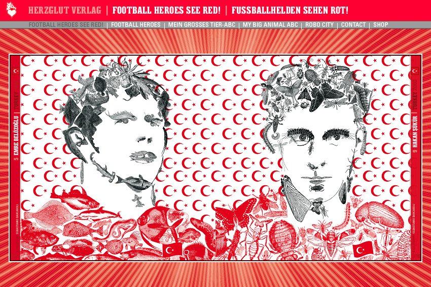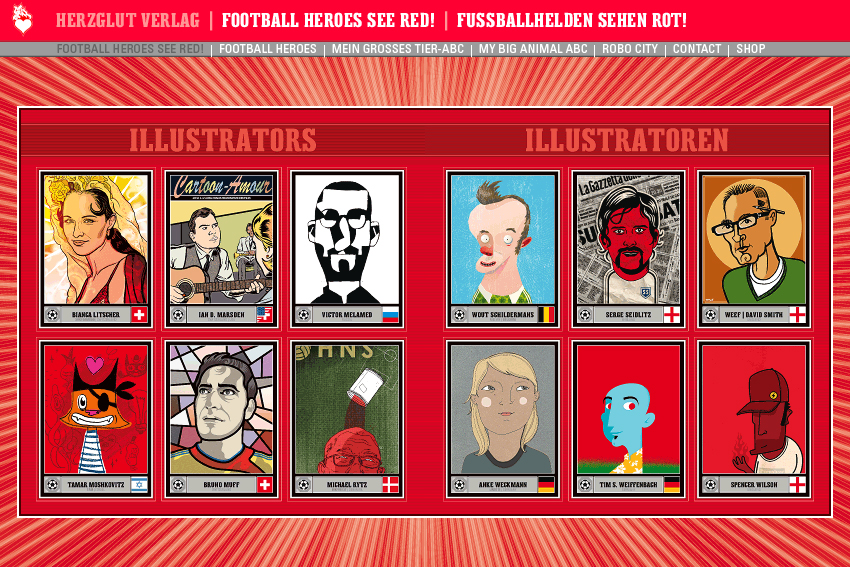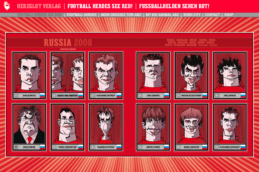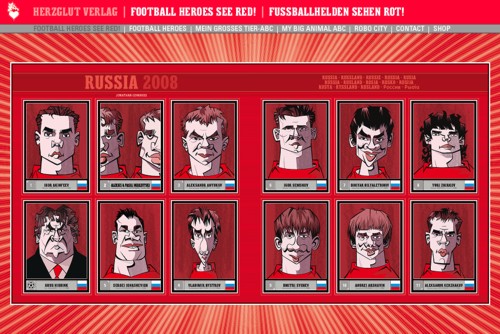 Герои Соккера. Футбольный ажиотаж докатился до художниковАльбом иллюстраций «Football Heroes see red» - сборник коллективных портретов сборных, участвующих в чемпионате мира по футболу в 2010 году. Организатор этого футбольно-иллюстративного проекта - швейцарец Kai Jerzoe, более известный как Jerzovskaya. Приглашенные им со всего мира иллюстраторы нарисовали каждый свою сборную по футболу. Единственное обязательно условие состояло в том, что все иллюстрации должны выглядеть как футбольные карточки, все остальное на усмотрении художников. Нашу сборную нарисовал Виктор Меламед.Кроме того в альбом вошли ретроспективные иллюстрации, например, серия посвященная Зидану и сборная Советского Союза 1964 года. 6 июня в швейцарском городе Винтертер началась выставка футбольных лиц. KAK.RU |