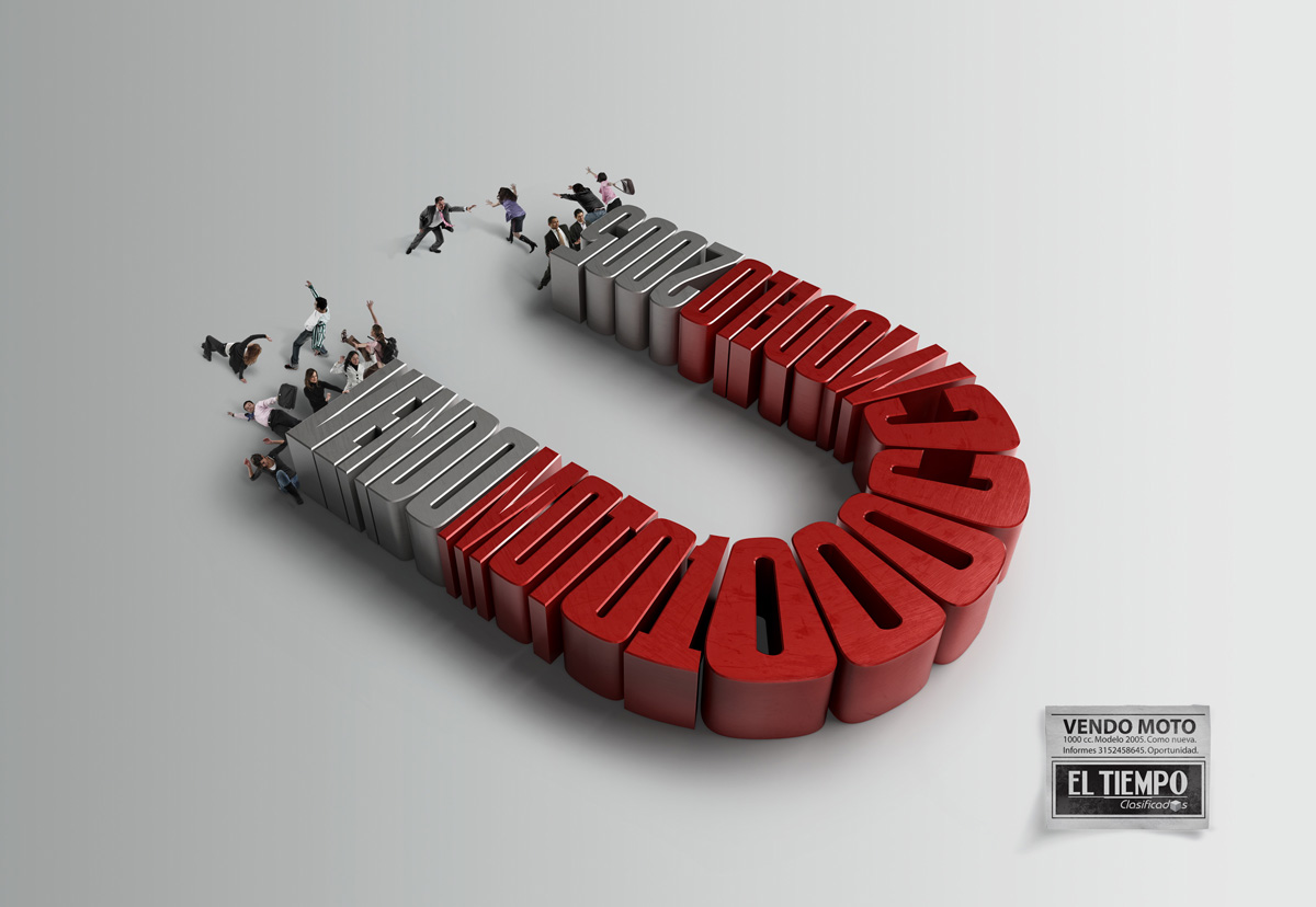 Реклама притягивает людей как магнитSancho BBDO и El Tiempo Newspaper считают, что тематические объявления, размещенные в специальных разделах на страницах газеты, оказывают на читателей огромное влияние. Результат этого наглядно демонстрирует Sancho BBDO с помощью рекламных принтов.Агентство: Sancho BBDO, Colombia Креативные директора: Giovanni Mart?nez, Hugo Corredor Копирайтер: Juan Felipe Rodriguez Фотограф: Alfonso Torres |