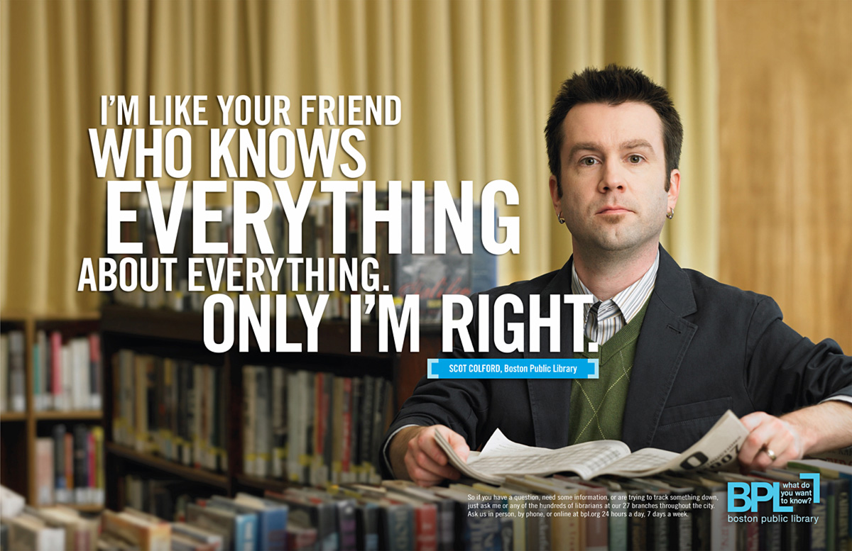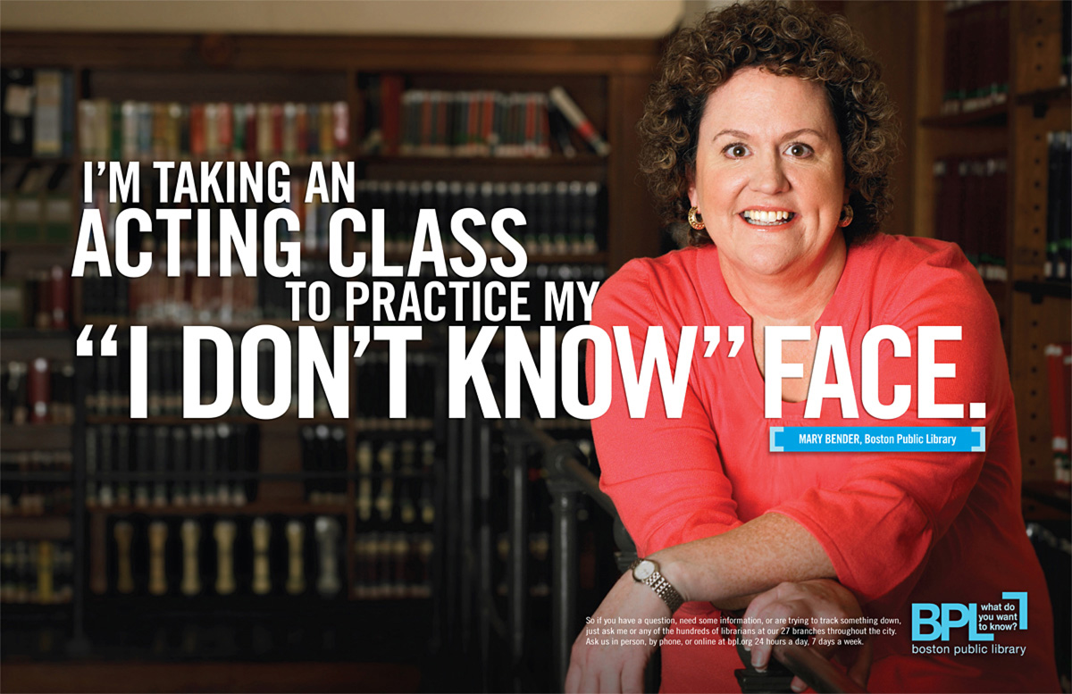 Сотрудники бостонской библиотеки отвечают на глупые и не очень вопросы 24 часа в суткиРекламная кампания Бостонской общественной библиотеки от агентства A&G вышла в свет под теглайном: "Что вы хотите знать?". Получить ответ на любой вопрос вы можете 24 часа в сутки, воспользовавшись широким спектром возможностей: спросить лично работников библиотеки, которых можно найти более чем в 27 отделениях библиотеки по всему городу, позвонить по телефону или задать свой вопрос на сайте bpl.org.Рекламное агентство: A&G, Massachusetts, U.S.A Арт директор: Maureen Metzler Фотограф: Craig Orsini |
