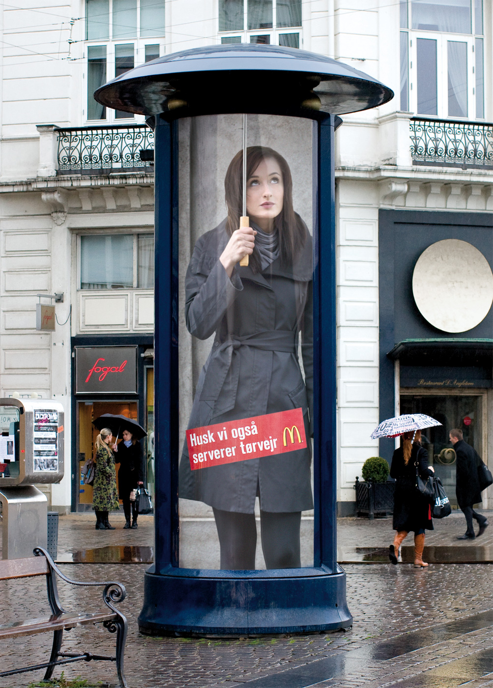 Под надежной защитой McDonald`sНа принтах от DDB показано стандартное место под наружную рекламу, которое можно встретить почти на любой улочке городов Дании. Верхняя часть не подвергалась модификации, всего лишь был вставлен постер с изображением девушки.Агентство: DDB Denmark Креативный директор: Patrik Danielsson Копирайтер: Mikkel Miller Фотограф: Thomas Juul |
