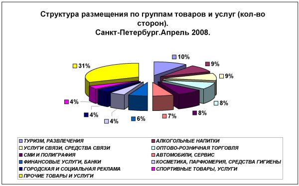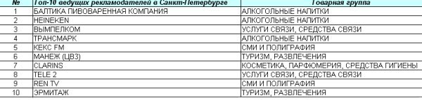 Любители «наружки». Апрель - 2008Северо-Западное представительство исследовательской компании «ЭСПАР-Аналитик» подвело итоги апреля в сегменте наружной рекламы. Топовая десятка рекламодателей, размещающих свои рекламные материалы с помощью рекламных конструкций различного вида и формата, по сравнению с мартом претерпела изменения. В лидеры в преддверии летнего сезона вновь вернулись пивные компании. Если в прошлом месяце «Пивоваренная компания «Балтика» была лишь на шестой строчке среди ведущих рекламодателей в петербургской наружке, то в апреле она возобновила рекламную активность и вернулась на первую позицию. Несколько отстала от «Балтики», но тем не менее обогнала остальных рекламодателей, и компания Heineken. Показательно также, что среди операторов сотовой связи, по-прежнему, наиболее активен «Вымпелком», который в апреле несколько уступил свои позиции «пивнякам», но остался в тройке лидеров.