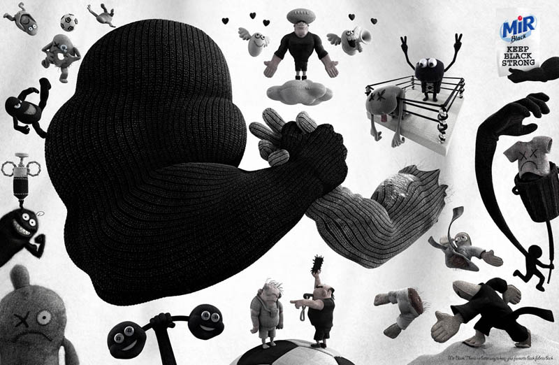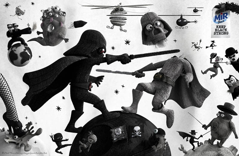 В чёрном городе. Новая рекламная кампания для французской бытовой химииАрмрестлинг с расистским подтекстом, огромные пауки и всеобщий любимец Дарт Вейдер должны, согласно задумке TBWA Paris, поведать нам о том, что настоящий черный цвет — это не просто нечто усреднённо-мрачненькое. Нет, чёрный должен быть угольным, неистовым, сокрушающим, лишающим всякой надежды и беспросветным. А об этом, как скромно сообщается в правом верхнем углу каждого из трёх принтов кампании, позаботится французское средство Mir Black.Вообще, конечно, такое можно было бы придумать о любом цвете, подобрав соответствующие масскультурные фигуры и знакомые всем с детства феномены. К примеру, флагманом кампании Mir Green мог бы стать источающий изумрудное сияние огр Шрек. А Mir Red, в каком-нибудь российском изводе, — ослепительно алый Синьор Помидор. Но чёрное на белом смотрится, согласитесь, очень красиво. via www.advertka.ru KAK.RU |
