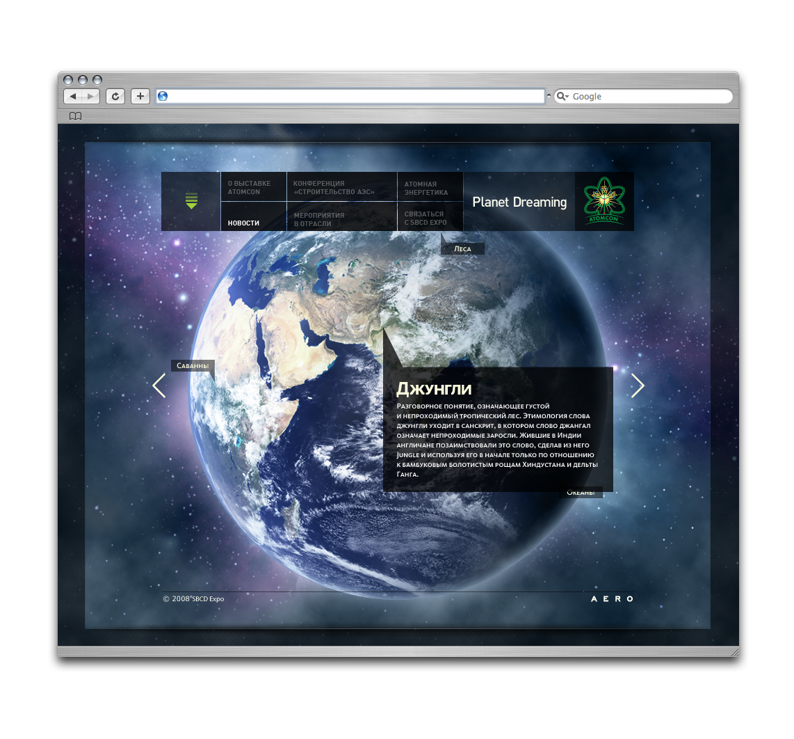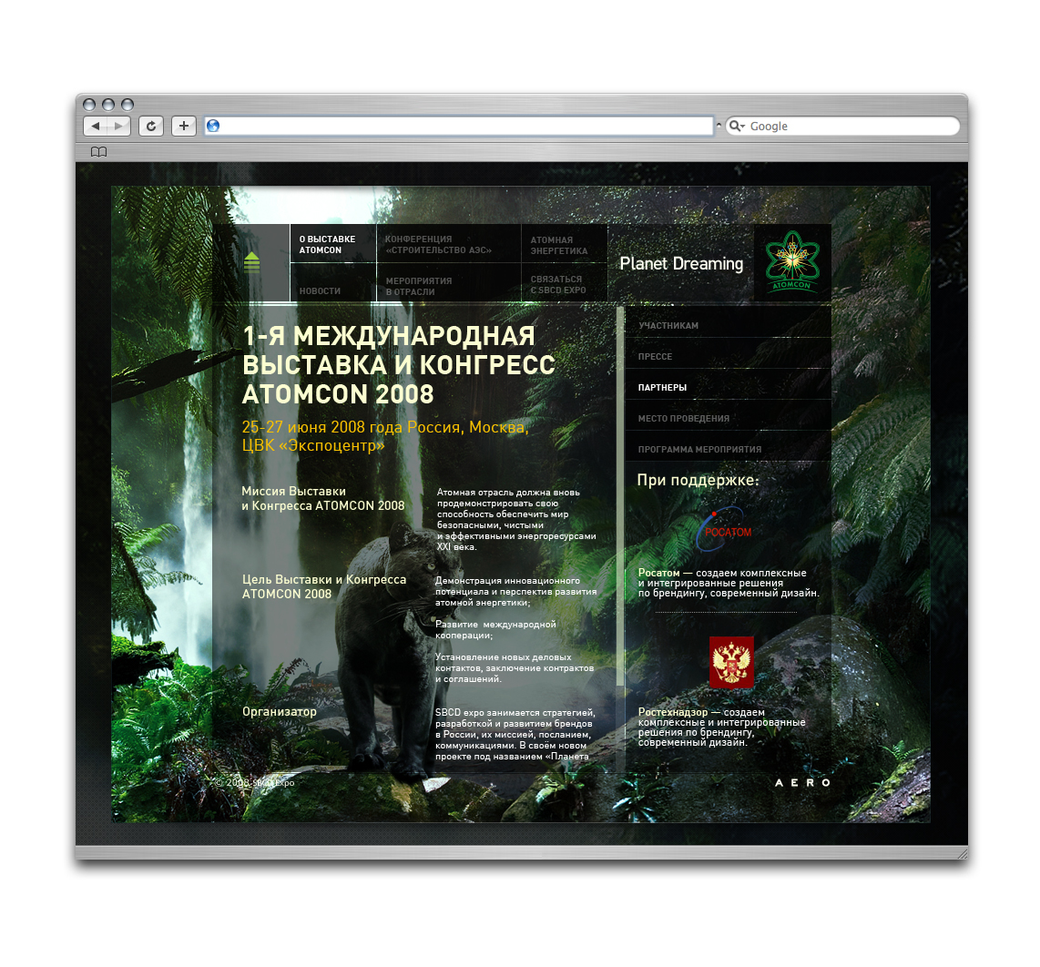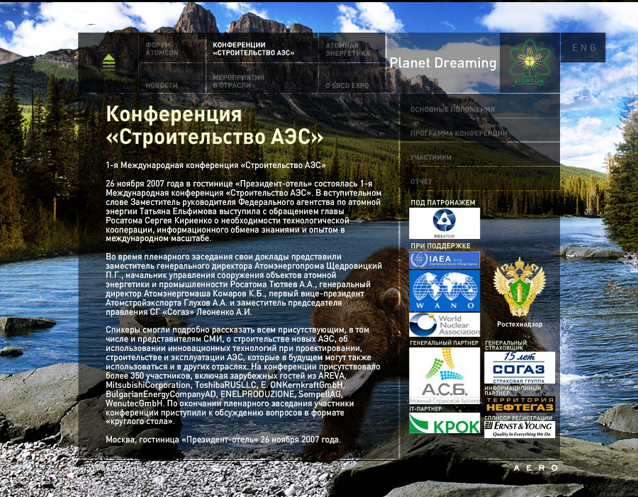 Агентство Aero разработало сайт для 1-ого международного форума Atomcon 2008Запуск www.atomcon.ru состоялся 19 июня. Atomcon 2008 проводится под патронажем ГК "Росатом" в рамках проекта Planet Dreaming, призванного изменить негативное отношение общественности к АЭС и поднять на иной уровень понимание перспектив атомной энергетики не только для участников рынка, но и для простых людей.Сайт atomcon.ru содержит информацию о форуме, новости атомно-энергетической отрасли, данные о мировых событиях в области энергетики, историю российской атомной энергетики и другую информацию. Форум пройдет 25-27 июня в московском Экспоцентре. Заказчиком Aero выступила компания SBCD Expo. |