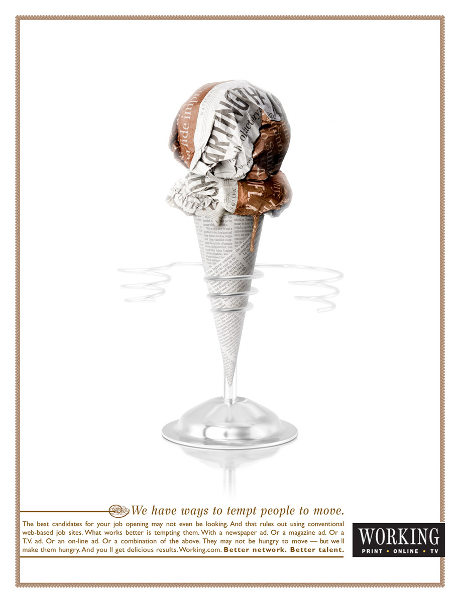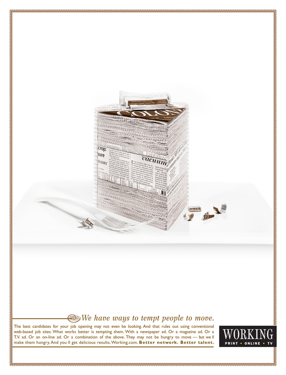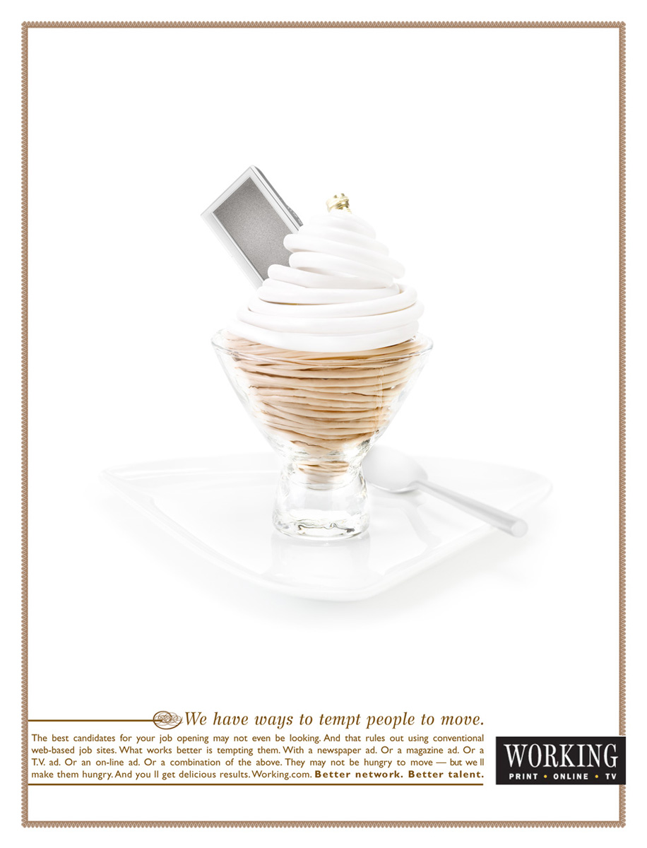 Working: так бы ее и съелРА ACLC и Working считают, что самый подходящий кандидат на тот или иной пост, которого так ищет работодатель, мог даже и не подозревать о ценной вакансии. Он не увидел объявление о найме или поленился позвонить. Working обладает широким спектром возможностей для размещения объявлений о найме, что гарантирует работодателю 100% эффект.У нас есть способы соблазнить человека сделать первый шаг. Агентство: ACLC, Toronto, Canada Копирайтер: Steve Conover Арт директор: Howard Beauchamp Фотограф: AKA Photography |