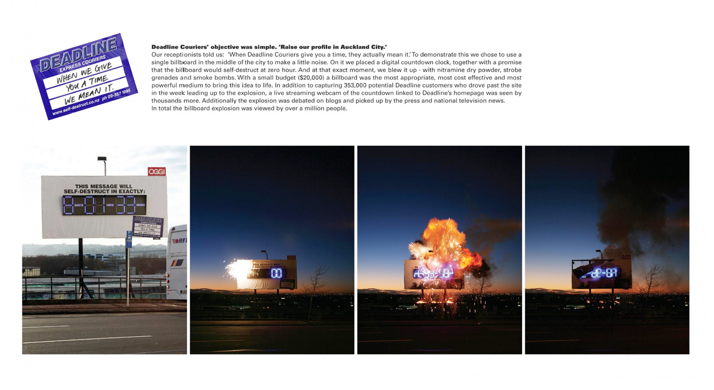 Взрывоопасный дедлайнДля того чтобы прорекламировать службу курьерской доставки Deadline агентство Colenso BBDO прибегло к интересному рекламному ходу. А именно - установило билборд с таймером и надписью, которая гласила о том, что эта надпись будет уничтожена, когда таймер подойдет к нулю. По прошествии определенного времени билборд, расположенные в центре города Окленд, взорвался. Целью кампании являлось доказать: если курьер фирмы Deadline говорит вам, что товар будет доставлен через 5/10/15/20 минут, именно это время он и имеет в виду, и ни секундой позже.Акция вызвала широкий резонанс среди общественности и была самым обсуждаемым событием в блогах и на национальном телевидении. Агентство: Colenso BBDO, Auckland, New Zealand Креативный директор: Richard Maddocks Копирайтер: Jamie Hitchcock, Josh Lancaster Фотограф: Stephen Langdon |