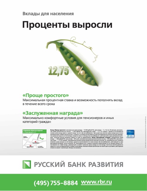 Русский банк развития стал проще простогоРекламная кампания по продвижению обновленного вклада "Проще простого" стартовала в начале июня этого года. Именно тогда клиенты Банка увидели новую эмблему вклада - спелый стручок гороха, а внутри вместо горошин блестят настоящие жемчужины. "В июле и августе 2008 года мы запланировали масштабные рекламные акции по продвижению этого вклада, - рассказывает Наталия Ковшель, заместитель начальника Департамента коммуникационного маркетинга Русского Банка Развития. - В продвижении вклада будут задействованы самые разные рекламные носители: плакаты в областных электричках и лифтах жилых домов 19 районов Москвы, рекламные ролики в маршрутных такси, оборудованных телеканалами "Маршрут-ТВ", и контекстная реклама в Интернете".Состав творческой группы: Команда Русского Банка Развития: Наталия Ковшель - куратор проекта Екатерина Ракчеева - менеджер проекта Визуализация идеи - РА "New Channel": Мария Путова - эккаунт-директор Александра Роскина - дизайнер |