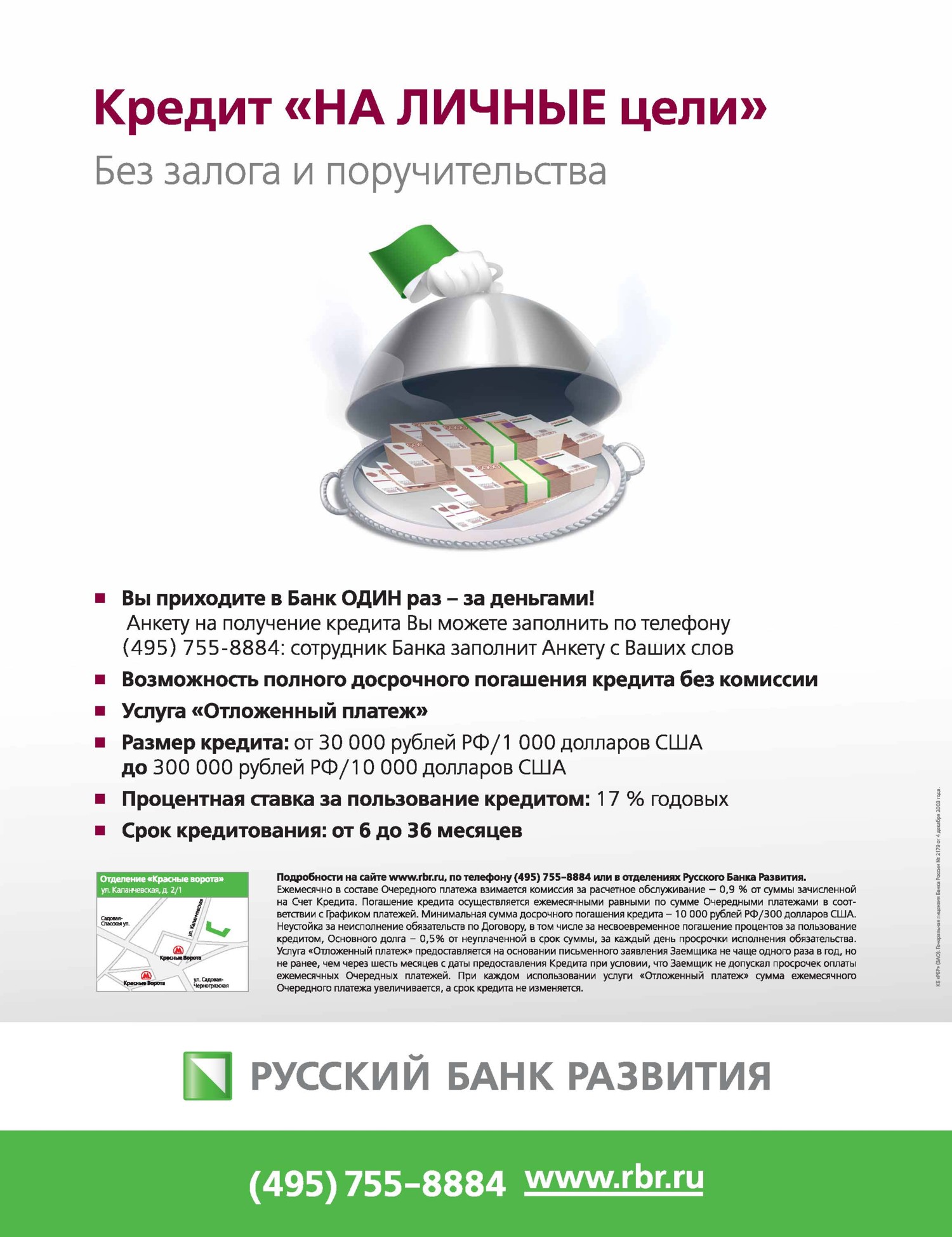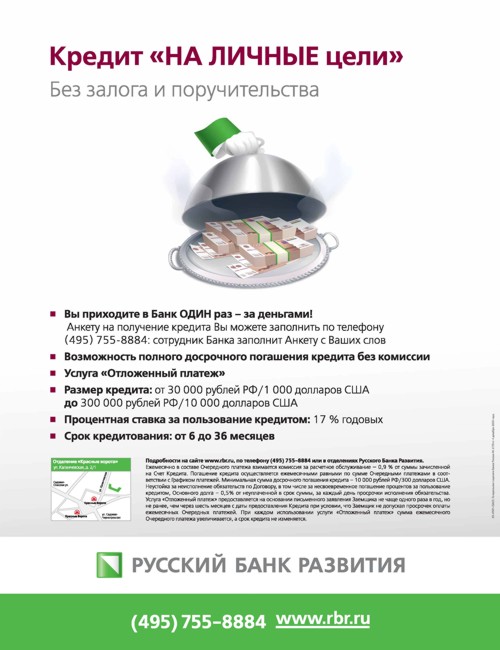 "Горячие деньги" от Русского Банка Развития "НА ЛИЧНЫЕ цели"Русский Банк Развития начинает рекламную кампанию по продвижению потребительского кредита "НА ЛИЧНЫЕ цели". На протяжении июля и августа посредством различных каналов коммуникаций - плакаты в московском метро и областных электричках, информационные блоки в печатных СМИ, рекламные ролики в 115 московских маршрутных такси, оборудованных "Маршрут-ТВ", а также путем контекстной рекламы в Интернете - Банк будет доносить до клиентов преимущества своего продукта. Суть позиционирования в простоте получения кредита, благодаря чему можно сразу решить свои финансовые вопросы, связанные с долгожданной покупкой.Состав творческой группы: Команда Русского Банка Развития: Наталия Ковшель - куратор проекта Екатерина Ракчеева - менеджер проекта Визуализация идеи - РА "New Channel": Мария Путова - эккаунт-директор Александра Роскина - дизайнер |
