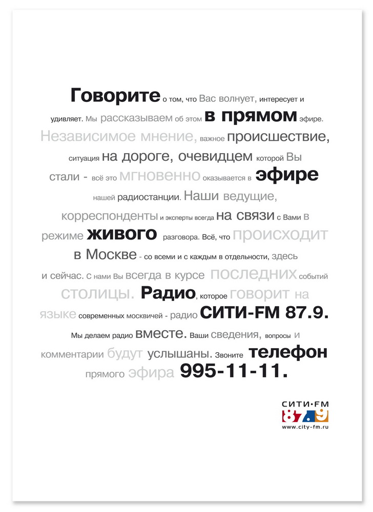 BoxSide окутал СИТИ FM тэговым облаком Городское информационное радио СИТИ FM старается подтвердить свой статус самого интерактивного социального радио столицы и использовать его в качестве своего основного позиционирования. В реализации этого замысла помогает Брендинговое агентство BoxSide brand & package.Исследования, проведенные среди слушателей этой и других информационных и информационно-развлекательных радиостанций, показали, что большинство респондентов выделяет СИТИ FM как единственную, которая рождает ощущение причастности, общности и возможности живого общения на понятном жителям столицы языке. "Эта информация не стала для нас открытием, а лишь подтвердила уверенность в том, что мы на правильном пути к созданию первого социально - интерактивного радио столицы" - говорит директор по маркетингу московского информационного радио СИТИ FM Мария Ефремова. "Нужно сказать, что существующий формат и программная сетка радиовещания не высосана из пальца, а создается, развивается и меняется именно благодаря интерактивности станции, разнообразию способов коммуникации и информационных сервисов, доступности эфира для радиослушателей и постоянному диалогу с ними". В связи с этим возникла необходимость корректировки бренд-платформы и концепции продвижения московского информационного радио СИТИ FM. Специалисты брендингового агентства BoxSide brand & package предложили дополнить бренд-платформу радиостанции с учетом сложившегося социально-интерактивного характера вещания радиостанции и сделать упор в системе позиционирования и продвижения бренда именно на это. "Учитывая тот факт, что нынешний формат вещания радиостанции полностью соответствует стремительно развивающимся и безумно популярным различным социальным сетям, существующим в web - пространстве, целесообразно позиционировать СИТИ FM как первое социальное интерактивное радио столицы" - говорит креативный директор брендингового агентства "BoxSide brand & package" Алексей Муразанов. По его словам, этот шаг будет эффективным не только потому, что это модное веяние времени, а главным образом потому, что каждый человек хочет говорить и быть услышанным, чувствовать себя социально значимым членом современного общества. Используя образ знакомого и функционального тэгового "облака", получившего широкое распространение в социальных сетях в качестве основного навигационного инструмента, креативная команда брендингового агентства "BoxSide brand & package" разработала концепцию рекламного объявления для новой рекламной компании радиостанции СИТИ FM. Этот ход позволил "убить сразу трех зайцев": проиллюстрировать принадлежность радиостанции к популярным социальным ресурсам, раскрыть основную направленность эфира и его формат, и поддержать главную мотивацию аудитории генеральным слоганом первого интерактивного радио столицы: "Говорите в прямом эфире живого радио СИТИ FM!" Кроме того, был создан ряд макетов, посвященных автомобильной, социальной тематике. Состав творческой группы: Креативный директор - Алексей Муразанов; Арт-директор - Жанна Резаева; Дзайн и верстка - Антонина Тарева; Аккаунт-директор - Ольга Аникина. |