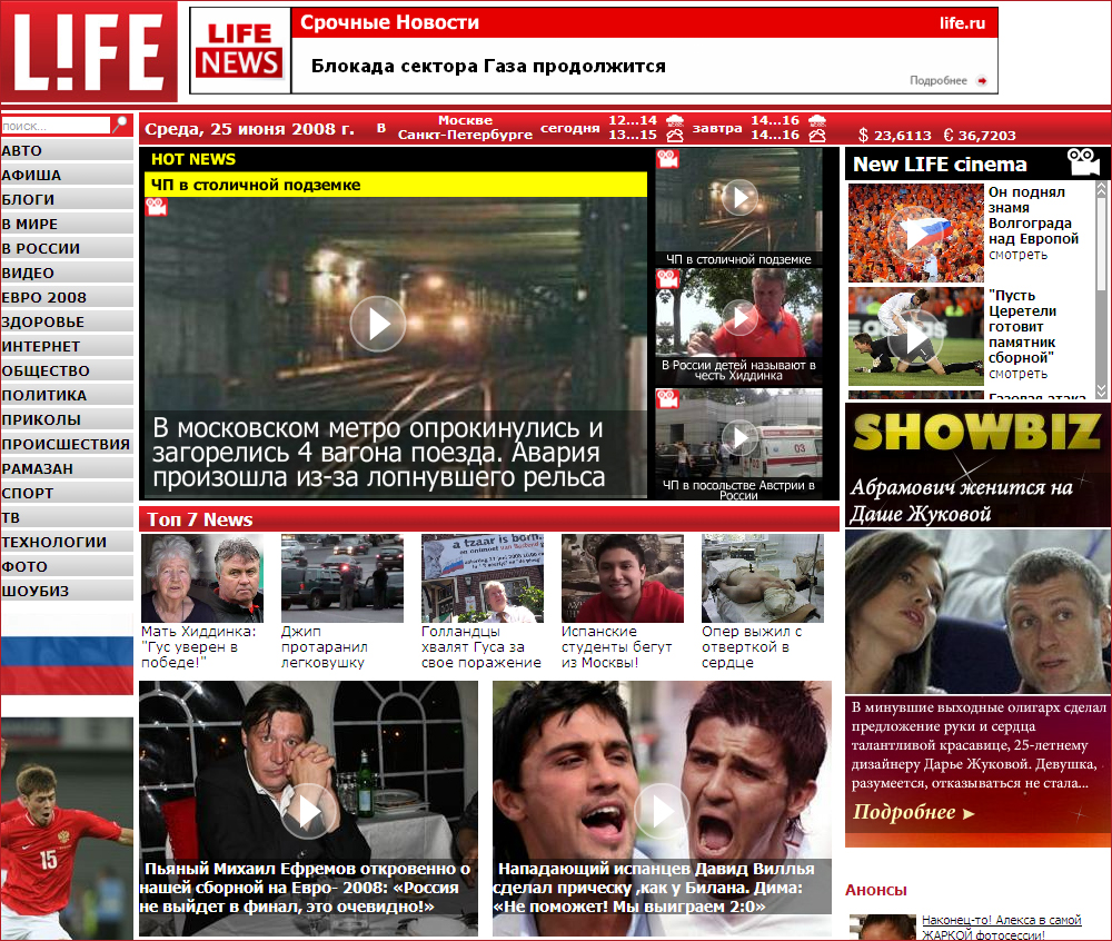 Исследовательская компания TNS Gallup Media опубликовала результаты исследований аудиторий интернет-проектов по Москве и России за май 2008 года. Согласно этим данным, Life.ru, принадлежащий ИД News Media, вышел на первую строчку среди новостных порталов. Ближайший конкурент - сайт "Комсомольской правды" отстает от Life.ru почти на миллион посетителей. В деловом сегменте первая тройка выглядит так: "РИА Новости", Gazeta.ru и Lenta.ru соответственно.