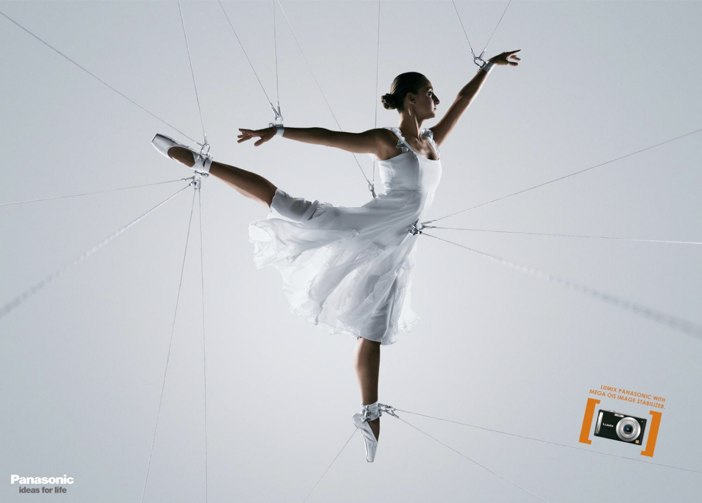Lumix Panasonic - картинка, замри!Для того чтобы подчеркнуть эффективность системы стабилизации изображения OIS, которой оснащены фотоаппараты Lumix от Panasonic, агентство Fischer America Comunicacao изобразило балерину, которую держат тросы. Тем самым, говоря потребителю о том, что ему больше не следуешь волноваться о качестве фотографий, OIS сделает все работу.Lumix Panasonic со стабилизатором изображения OIS Агентство: Fischer America Comunicacao Total, Sao Paulo, Brazil Креативные директора: Fl?vio Casarotti, Pedro Cappeletti Копирайтер: Pedro Guerra Арт директор: Ricardo Big Passos Фотограф: Pedro Dimitrov |
