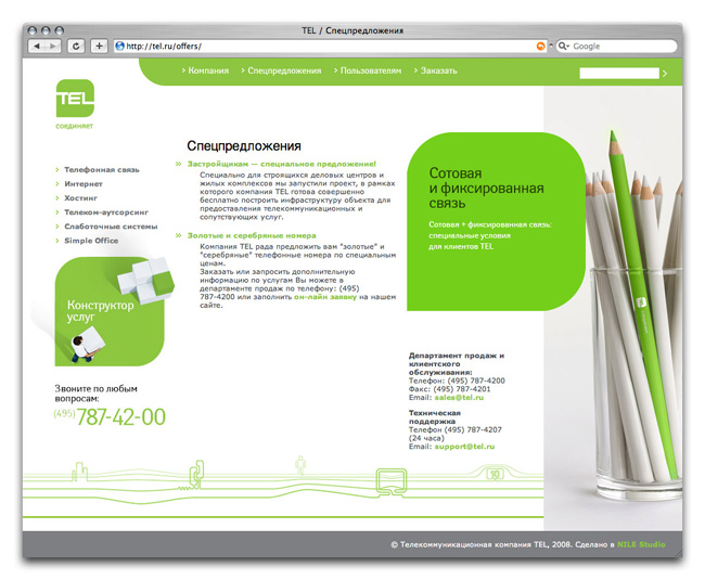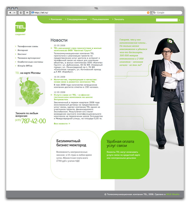 Nile Studio: Фирстиль, сайт, буклет, наружка для компании TELОтношения между компаниями Nile Studio и TEL начались еще в прошлом году, когда дизайн-студия начала работы по обновлению марки известного в Москве телекоммуникационного оператора. Теперь, в рамках этой работы, был создан целый ряд фирменных материалов. Это и буклет компаниии корпоративный интернет-сайт и наружная реклама. В оформлении буклета дизайнеры решили отойти от традиционных стереотипов, характерных для сферы телекоммуникаций. Главными героями буклета стали два персонажа - мужчина и женщина, которые, словно участники пантомимы разыгрывают сюжеты, иллюстрирующие название разделов буклета. Для этого была организованна специальная фотосессия с участием профессиональных фотомоделей. Материалы из этой фотосессии были использованы также и для оформления корпоративного сайта компании TEL(www.tel.ru). Другой элемент оформления корпоративных материалов - линейные пиктограммы - неотъемлемая часть фирменного стиля. Сейчас эти линии пронизывают сайт и буклет, их можно увидеть в наружной рекламе. А в скором времени они украсят интерьеры нового офиса TEL и фирменные автомобили компании. |