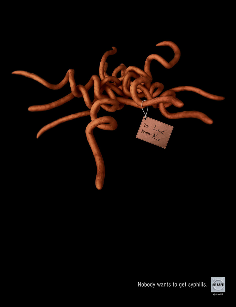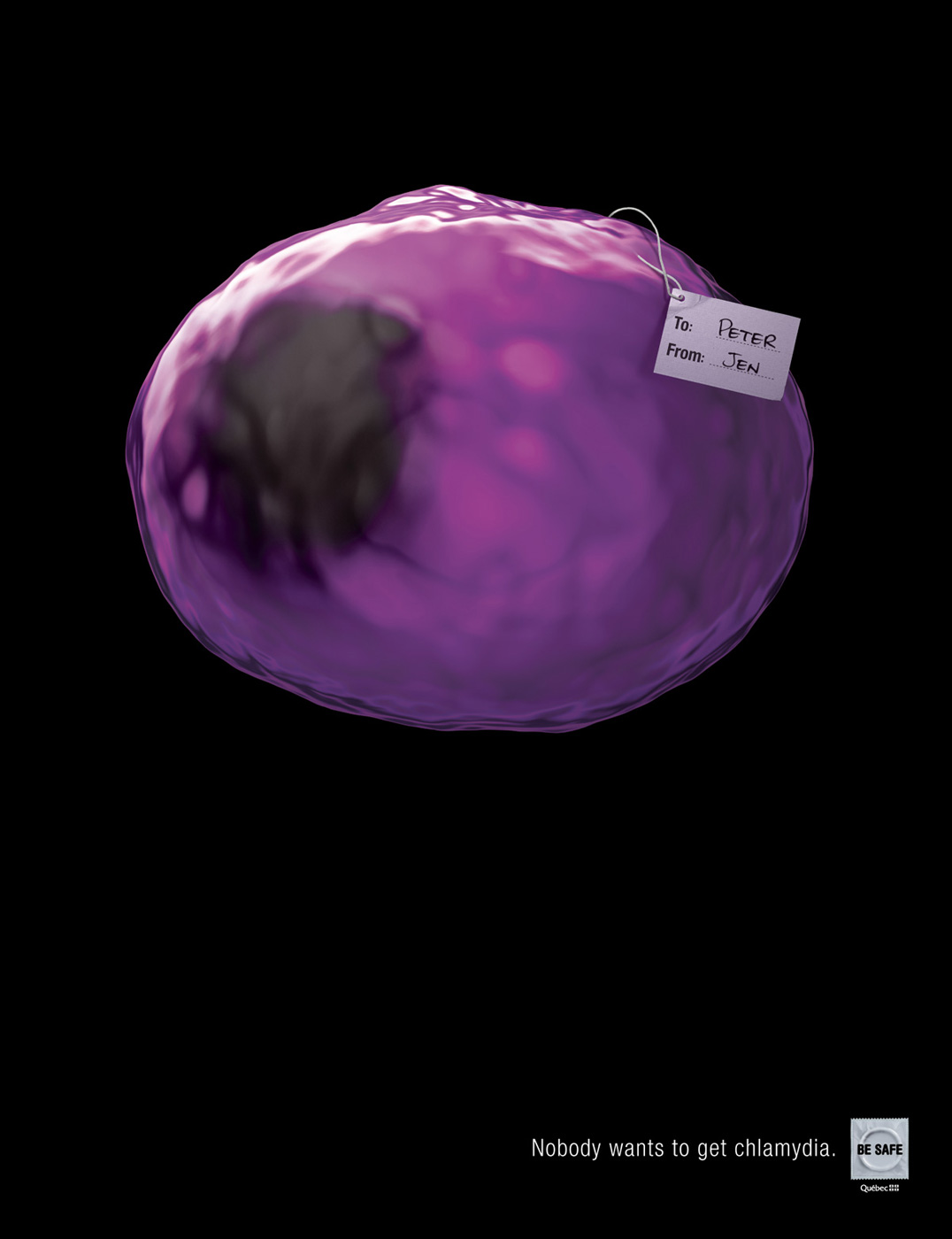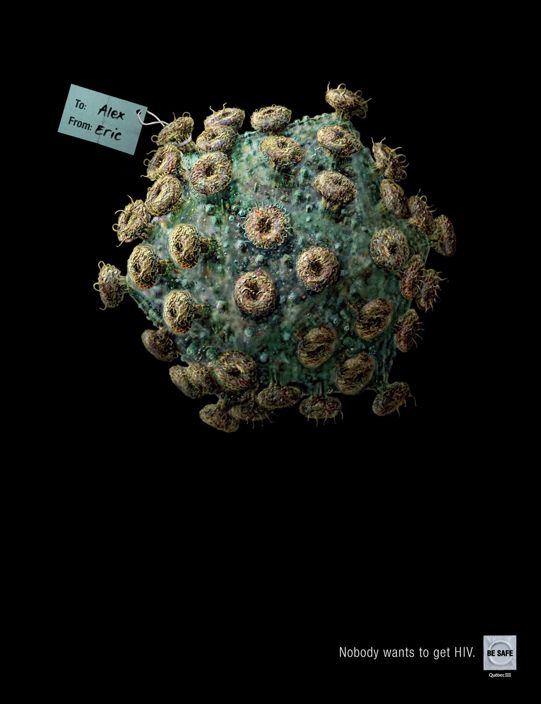 Алекс подарил Эрику ВИЧ. Министерство здравоохранения Канады призывает использовать презервативыДля того чтобы наглядно показать общественности все "прелести" секса без презерватива агентство из Канады Lg2 показало как выглядят вирусы, вызывающие болезни передающиеся половым путем, которые сопутствуют незащищенным случайным половым связям.Никто не хочет получить ВИЧ Никто не хочет получить сифилис Никто не хочет получить хламидиоз Агентство: Lg2, Quebec City, Canada Копиайтер: Luc DuSault Арт директор: Jack Latulippe Иллюстратор: Marc Rivest |