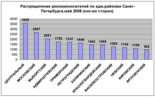 Самыми богатыми на рекламные конструкции различных форматов остаются Центральный район (3 605 поверхностей), Московский (2687) и Выборгский (2051).