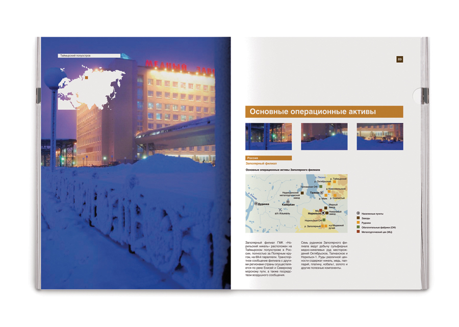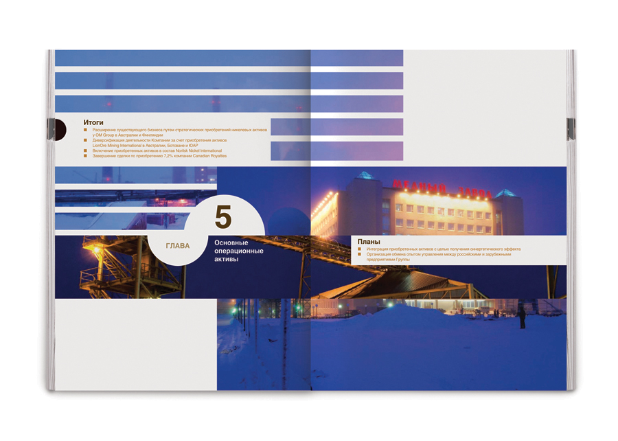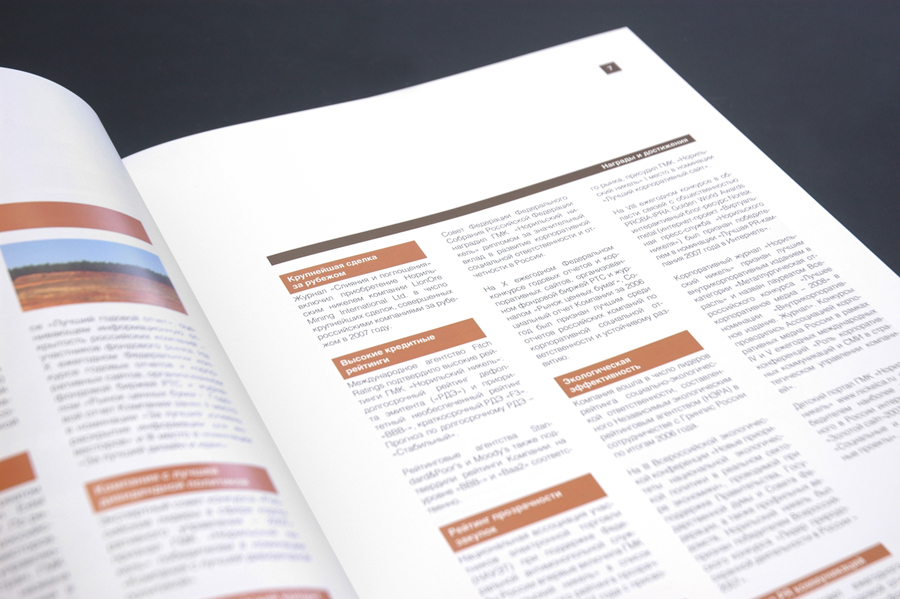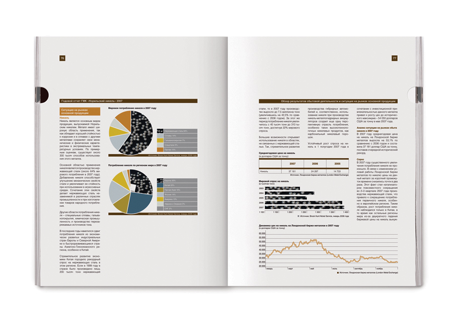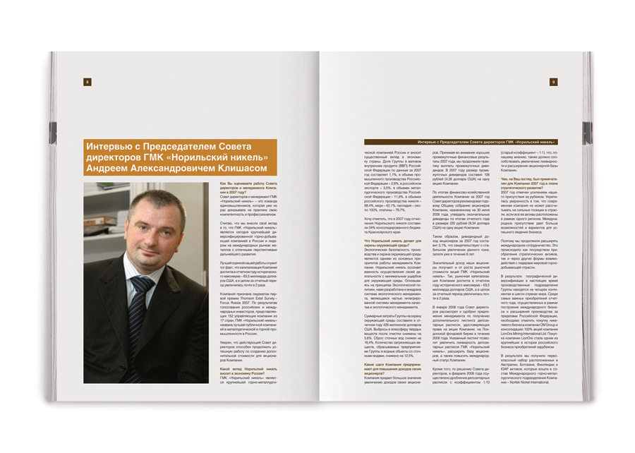 "Энди_Зайн" отразил "Норильский никель"В Бюро графического дизайна и визуальных коммуникаций "Энди_Зайн" реализован проект "Годового отчёта 2007" производителя цветных металлов - ГМК "Норильский Никель".Годовой отчёт - отражение самого предприятия. Объёмный, масштабный - настоящая энциклопедия горной металлургии. В тоже время, отчёт чист и лаконичен. Яркие иллюстрации сочетаются со строгой деловой версткой текста и аналитического материала, призванного формировать образ открытого предприятия глобального масштаба. Состав творческой группы Дизайнер: Наталья Эдис Арт-директор: Мария Белавина Pre-press инженер: Свиридов Кирилл Руководитель проекта: Александр Словесник Менеджер: Валентина Ершова |