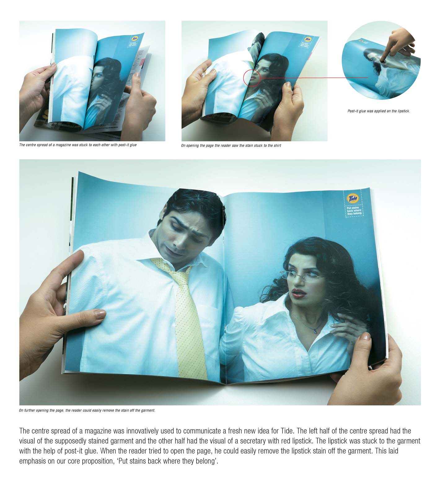 Tide возвращает пятна их адресантамАгентство Leo Burnett Mumbai разработало оригинальную печатную рекламу для Tide, наглядно показав отбеливающее действие стирального порошка. На левой странице журнального разворота изображен мужчина в белоснежной рубашке с пятном от помады, а на правой - испуганная секретарша, на губы которой нанесен клей. В процессе открытия разворота пятно на рубашке посредством клея прилипает на губы девушки. Таким образом, креативная команда передает главное преимущество бренда - быстроту удаления пятен. Слоган рекламы звучит как "Верните пятна туда, откуда они пришли" и вербально подтверждает идею принта. |
