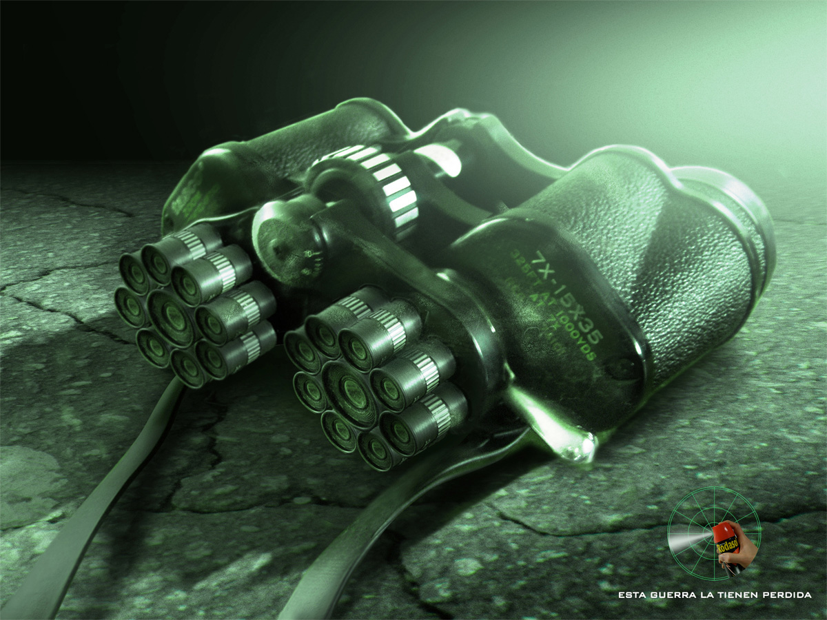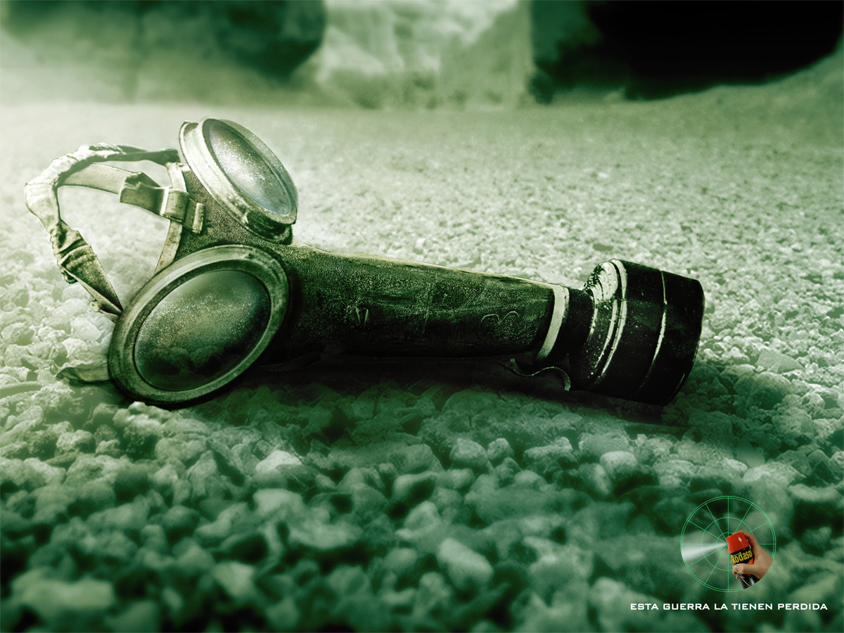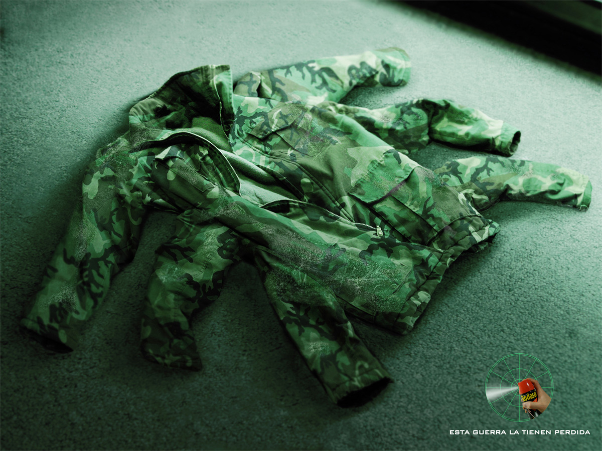 Rodasol - оружие массового поражения насекомыхКак бы ни старались домашние насекомые типа тараканов и муравьев, обеспечивая себя подходящим обмундированием, войну с человеком им не выиграть, поскольку существует Rodasol.Они проиграют эту войну Агентство: Euro RSCG, Колумбия Творческий директор: Cruz Mujica Арт-директор: Nicolas Lozano Копирайтер: Bryan Moreno |