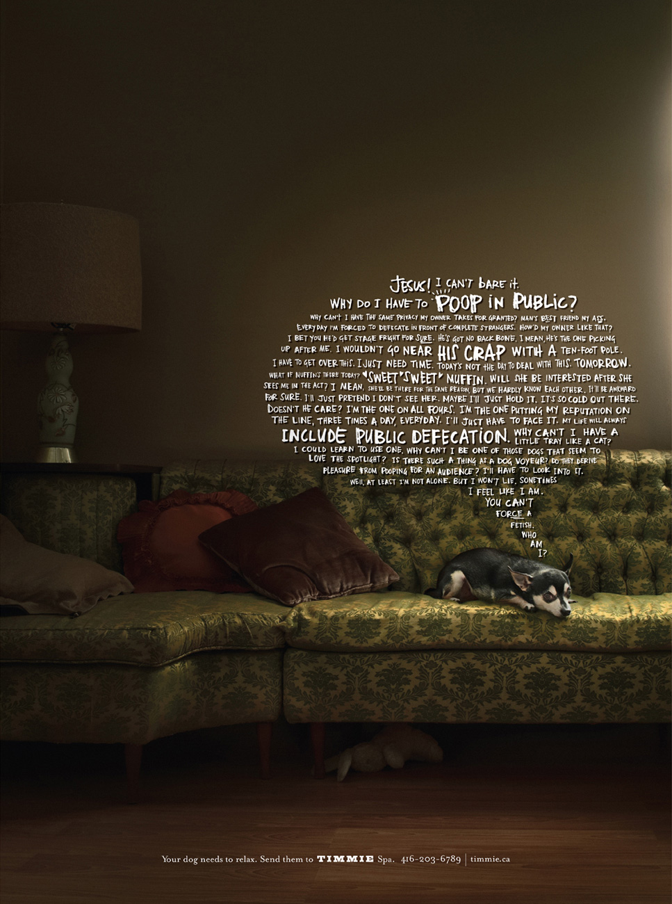 Насущные проблемы собак в рекламе spa салона TimmieЕсли вы считаете, что жизнь рядовой домашней собаки проста и безоблачна, то вы сильно ошибаетесь. РА DDB Canada и Timmie утверждают, что собака испытывает огромный стресс оттого, что постоянно лижет себя, или нюхает чьи-то "орешки". Но не все потеряно, благодаря spa салону для собак Timmie ваш питомец сможет отвлечься от тягостных раздумий и расслабиться.Агентство: DDB Canada, Toronto, Canada Креативный директор: Andrew Simon Арт директор: Paul Riss Копирайтер: Matt Antonello Иллюстратор: Rachel Riordan Фотограф: Frank Hoedl |