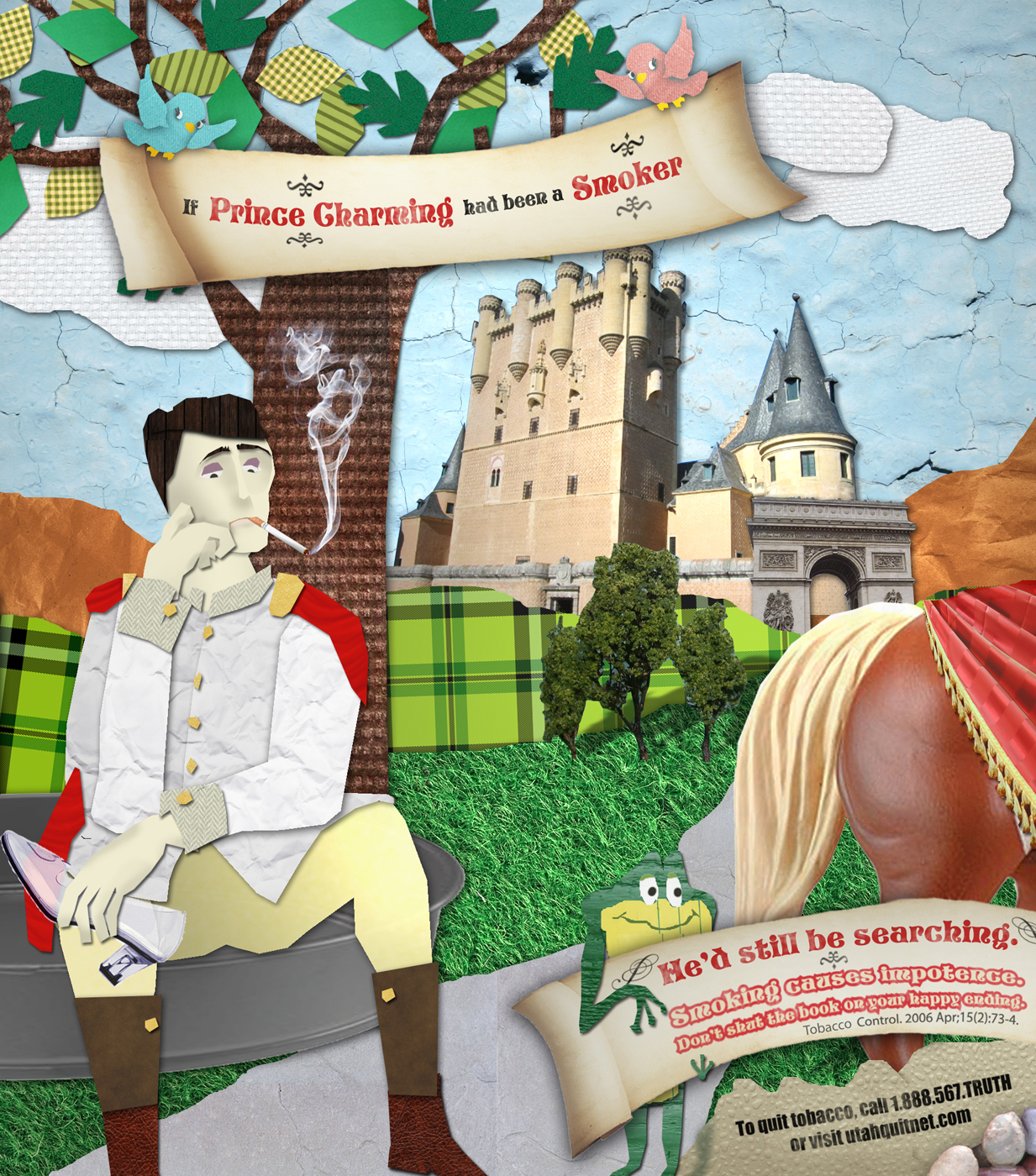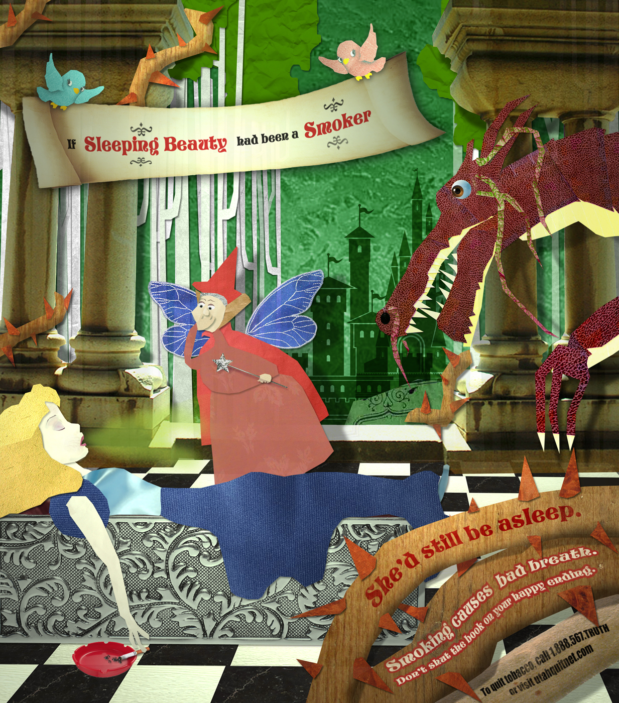 The Truth: счастливого конца не будет из-за сигаретВ этой социальной кампании, разработанной американским агентством Love Communications по заказу общественной организации The Truth, использованы образы таких всемирно известных сказочных персонажей, как Спящая Красавица, Рапунцель и Прекрасный Принц. На их примере как взрослым, так и детям показывают печальные последствия табакокурения.Если бы Спящая Красавица курила, она бы до сих пор спала. Курение - причина плохого запаха изо рта. Если бы Рапунцель курила, она до сих пор жила бы в башне. Курильщики в 77% случаев чаще страдают от потери волос. Если бы Прекрасный Принц курил, он до сих пор оставался бы в поисках. Курение вызывает импотенцию. Агентство: Love Communications, Солт-Лейк-Сити, США Творческий директор: Preston Wood Арт-директор: Trent Wall Копирайтер: Alison Faulkner |
