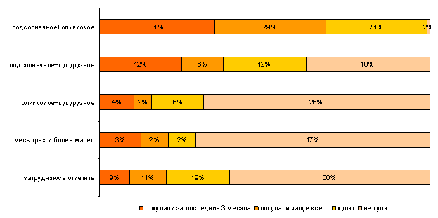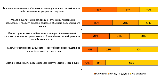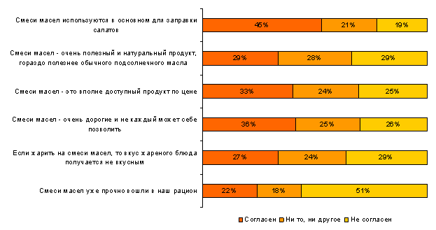Полезное, привычное, вкусное. Так российские хозяйки оценили растительное маслоИсследовательский холдинг Ромир совместно с компанией «Солнечные продукты» выяснил, на какие качества при выборе растительного масла в первую очередь обращают внимание российские хозяйки. Опрос проводился методом формализованного интервью по месту жительства респондентов. Всего опрошено 1552 женщины в возрасте от 25 до 45 лет, горожанок, проживающих в различных регионах России. Представители целевой аудитории в первую очередь при покупке ориентируются на натуральное, полезное, подходящее практически для всех блюд, не содержащее холестерина и консервантов растительное масло. Также немаловажным фактором для них является его постоянное присутствие в продаже. 76% респондентов считают, что растительное масло гораздо полезнее маргарина, 72% назвали подсолнечное масло наиболее привычным и основным в использовании, одним из самых полезных продуктов считают растительное масло 71% участников опроса. С тем, что растительное масло гораздо полезнее сливочного согласились 62% опрошенных. 64% определяют качество растительного масла по тому, как оно ведет себя во время жарки, 63% респондентов стараются при жарке пользоваться только подсолнечным маслом, потому что другие масла придают неприятный привкус блюдам. 62% определяют качество масла по его цвету и прозрачности. Каждый второй (53%) стал бы использовать только оливковое масло при готовке, если бы оно стоило столько же, сколько и другие растительные масла. Больше всего желающих использовать при готовке только оливковое масло в Москве и Нижнем Новгороде (при условии, что оно стоило бы столько же, сколько и другие растительные масла). Большинство потребителей считают, что только известный производитель может гарантировать пользу растительного масла, именно он обеспечивает отсутствие холестерина и консервантов в продукте. Для потребителей в возрасте 40-45 лет растительное масло традиционный продукт, причем предпочтение при жарке отдается именно подсолнечному маслу, как не оставляющему привкуса. Потребители в возрасте от 30 до 34 лет еще нашли «своего» масла. Они хотели бы покупать растительное масло в емкостях маленького объема и считают, что только известный производитель может гарантировать производство масла без консервантов. Среди потребителей наиболее сильны стереотипы в отношении смеси масел. Самые сильные из них – это то, что смеси масел в основном годятся для заправки салатов, а также несогласие с тем, что смеси масел уже прочно вошли в наш рацион. Диаграмма 1. Распределение ответов на вопрос «Сейчас я вам зачитаю несколько высказываний, сделанных разными людьми о растительном масле. По каждому высказыванию оцените, пожалуйста, насколько вы согласны или не согласны с ним» Молодежь в возрасте 25 – 29 лет считает, что смеси масел портят вкус жареного блюда. Потребители 30 – 34 лет предполагают, что данный продукт используется для заправки салатов, и он доступен по цене. Более старшая возрастная категория от 40 до 45 лет считает смеси масел полезным, но в то же время дорогим маслом, которое не каждый может себе позволить. Диаграмма 2. Распределение ответов на вопрос «Сейчас я вам зачитаю несколько высказываний, сделанных разными людьми о растительном масле. По каждому высказыванию оцените, пожалуйста, наскол