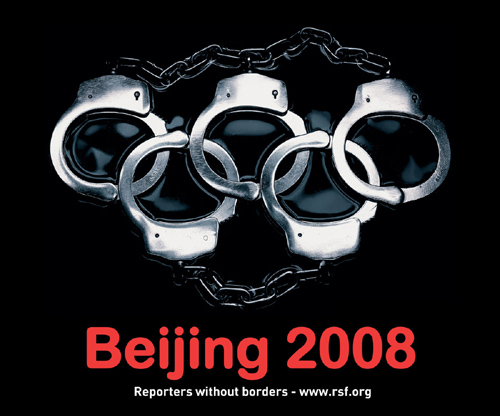 Международная организация "Репортеры без границ" также использует Олимпиаду как повод выступить за права журналистов и свободу слова. Суровая цензура в китайских СМИ отражена на принте, где в виде пяти олимпийских колец изображены наручники.