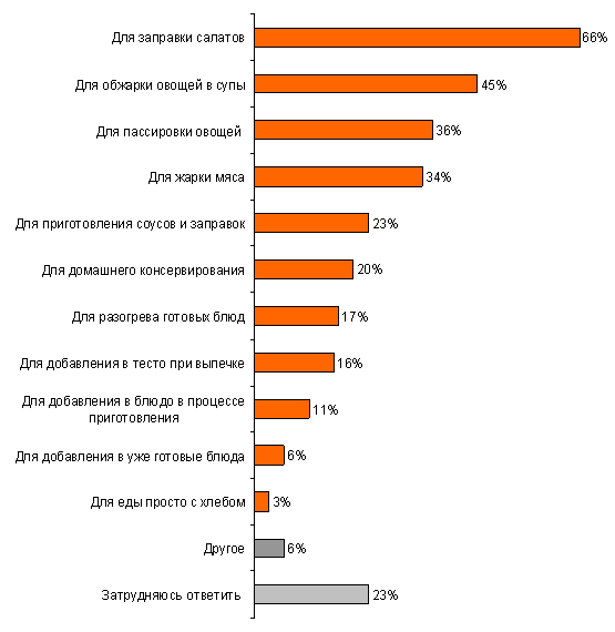 Добавлять – так витамины. Ромир выяснил какие добавки в растительное масло хозяйкам нравятся, а какие – нетИсследовательский холдинг Ромир совместно с компанией «Солнечные продукты» провел опрос среди 1552 женщин в возрасте от 25 до 45 лет об их отношении к растительным маслам с добавками. Опрос проводился методом формализованного интервью.Из всех видов растительного масла потребители отдают предпочтение растительному маслу с добавками витаминов, лидирует здесь масло с добавками витамина Е, далее следуют масла с добавками витаминов A, D, C, B, F. Каждый четвертый опрошенный за последние три месяца покупал масла с добавками специй, ароматических трав и гуараны. При этом в два раза больше респондентов (42%) отвергают для себя вариант покупки такого масла, в то время как от покупки масла с витаминами отказывается лишь 1% потребителей. Диаграмма 1. Распределение ответов на вопрос «Растительное масло с какими добавками вы покупали в течение последних трех месяцев?» ![]() Диаграмма 2. Распределение ответов на вопрос «Растительное масло с какими добавками вы покупаете чаще всего?» Выразили намерение купить растительное масло с добавками витаминов в будущем почти половина опрошенных (49%), каждый пятый купил бы в будущем масло со специями (20%), 14% купят растительное масло с добавками трав, затруднились с выбором 27% респондентов. Примерно половина потребителей растительного масла с добавками (48%) затруднилась выбрать вид масла, от которого она бы отказалась от покупки в будущем. Также была выявлена тенденция, что масло с гуараной отвергается потребителями в качестве будущей покупки несколько чаще. 40% покупателей растительного масла с добавками пользуются им каждый день, на особый случай «приберегает» его 23% респондентов. Затруднились определить как часто они пользуются таким маслом 38% опрошенных. Обычно растительным маслом с добавками витаминов потребители заправляют салаты (66%), как считают респонденты, это основное предназначение данного продукта. Также хозяйки используют его для тех же целей, что обычное растительное масло – жарят и пассируют овощи, жарят на нем мясо, готовят соусы и заправки, используют в домашнем консервировании. Диаграмма 3. Распределение ответов на вопрос «Для каких целей вы обычно покупаете масло с добавками?» Самый предпочтительный вид масла с добавками для потребителей – оливковое (65%), далее следует подсолнечное масло – 44%, каждый пятый назвал в качестве основы для масла с добавками кукурузное (21%). www.rmh.ru |