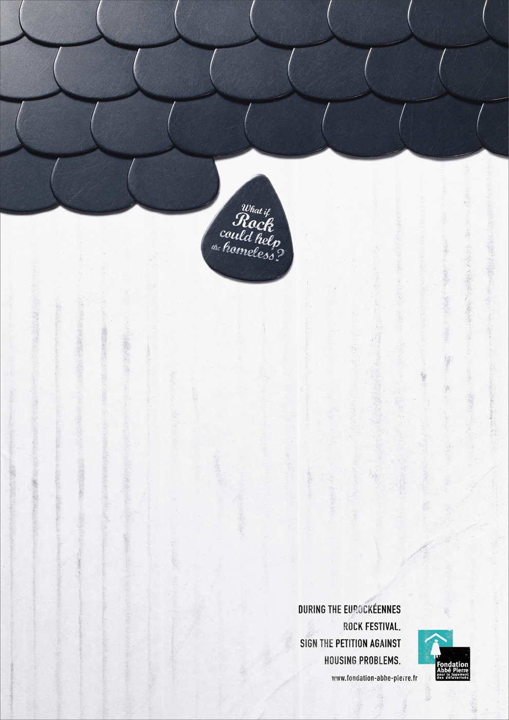Рокеры борются с нищетойBDDP & Fils совместно с рок фестивалем Foundation Abbe Pierre предлагают всем ценителям тяжелой музыки подписать петицию, направленную на решение проблем бездомных людей. Черепица из медиаторов подчеркивает тэглайн и демонстрирует зрителю - нет ничего невозможного, твое участие может оказаться кирпичом в доме для бездомных.Что бы было, если бы рок смог помочь бездомным людям? Агентство: BDDP & Fils, Paris, France Креативный директор: Guillaume Chifflot Арт директор: David Derouet Копирайтер: Emmanuel de Dieuleveult Фотограф: Roberto Badin Стилист: Carole Gr?goris |