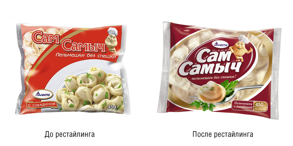 После проведения рестайлинга композиция элементов дизайн-концепции выглядит более централизованной, её ключевым элементом стал Сам Самыч - фантазийный герой, который рекомендует пельмени. "Закрытая", как говорят психологи, поза персонажа была изменена в сторону позитивной, "открытой". Весёлый, добродушный Сам Самыч - идеальный помощник на кухне. Наклон логоблока добавляет композиции динамики. В целом дизайн-концепция стала более лаконичной и современной, а яркость и контрастность цветов, сделали бренд более заметным на полке в ряду конкурентов.