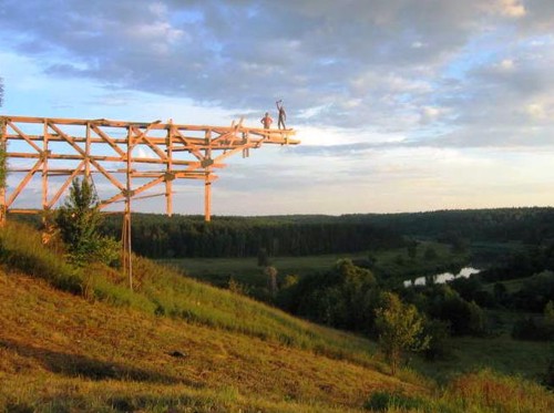 Идея "хождения в народ" принадлежит художнику Николаю Полисскому, знакомый по движению "митьков". Заручившись поддержкой местных жителей, он начал возводить здесь фантастические лэнд-артные объекты из подручных материалов: сена, хвороста, снега и дерева. С легкой руки Полисского жители Никола-Ленивца превратились в художников, а некому неизвестная деревенька в Калужской области - в центр ландшафтного искусства.