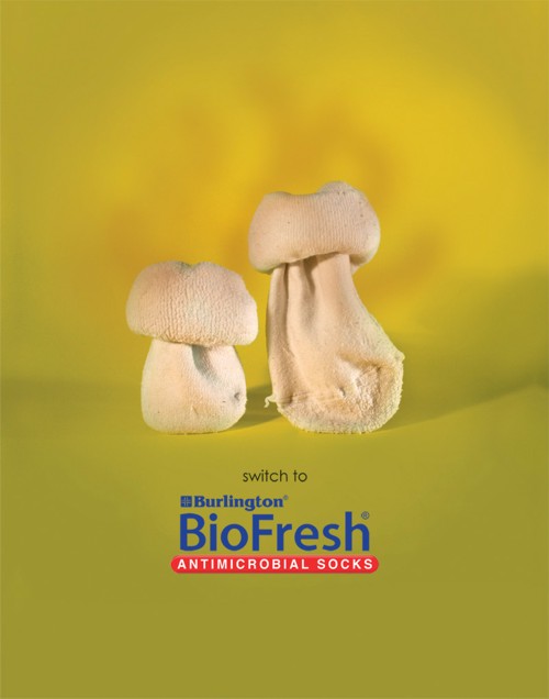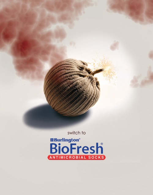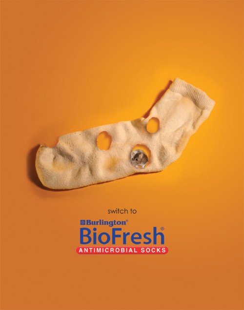 Носки с запахом сыра и грибов остались в истории. На рынке появились BioFreshРекламная кампания специальных носков от компании Burlington показывает потребителю, во что превращаются носки после носки и как запахи эти носки источают. Если вы не хотите, чтобы вас ассоциировали с запахом исходящим от носков, то самое время обратиться к продукции Burlington под брендом BioFresh.Креативный директор/Арт директор: Lawrence Antaran Фотограф: Arrjae Puno |