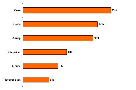Шестерка лидеров по предпочтениям в качестве мест отдыха выглядит следующим образом: на первом месте – Сочи, там отдыхал каждый пятый опрошенный (20%), на втором – Анапа (17%), которая по популярности стоит практически на одном уровне с Адлером (16%), далее следуют Геленджик (10%), Туапсе (8%) и Лазаревское (6%).