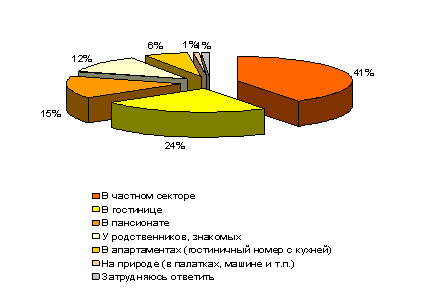 Основная часть отдыхающих (41%) предпочитают жить в частном секторе. Гостиницу как место проживания на курорте выбирает каждый четвертый опрошенный (24%). В пансионате согласны остановиться 15% респондентов, у родственников и знакомых – 12% опрошенных. Провести свой отпуск в палатках или машине готовы лишь 1% респондентов.