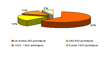 Большинство отдыхающих готовы потратить на себя лично во время последнего отпуска не более 250 долларов – так ответили 62% респондентов, каждый пятый потратил от 250 до 500 долларов, более 1500 долларов за отдых потратили 6% опрошенных.
