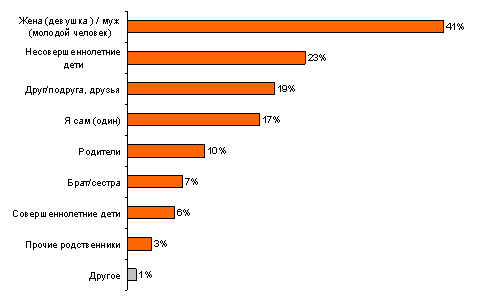 Компанию отдыхающим чаще всего составляют их вторые половины, будь то муж, жена, девушка или молодой человек (41%).