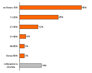 Большинство отдыхающих на море предпочитают проводить отпуск на одном месте, только 3% респондентов заявили, что проводили на экскурсиях вне основного места отдыха более 50% отпускного времени, 40% напротив признались, что отводили на экскурсии и поездки не более 10% времени.
