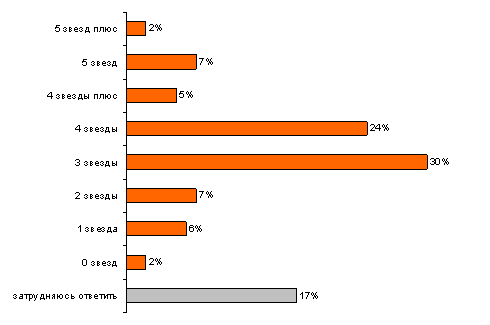 В выборе гостиницы респонденты проявили завидный демократизм – на отдых в трехзвездочном отеле согласен каждый третий опрошенный – 30%, четыре звезды выбрали 24% респондентов, пятизвездочного уровня гостиничного сервиса ждут для себя 7% отдыхающих.