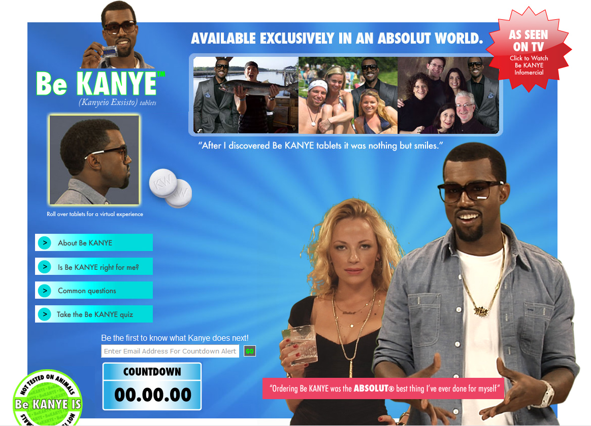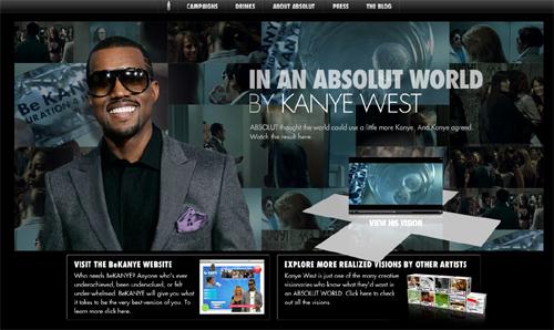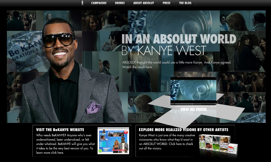 Водка Absolut продолжает успешную концепцию «In an Absolut world», предлагая неуверенным мужчинам стать копией талантливого музыканта Канье Веста, выпив чудодейственную таблетку Be Kanye. Компания точно подметила, что в каждом из нас живет мечтатель, человек с нереализованными фантазиями, и создала новый мир, который так же идеален как и водка Absolut. Новаторская для рынка алкоголя кампания началась в мае 2007, а с начала текущего года представлен проект «Visionaries», в рамках которого выдающиеся творческие личности и потребители «Absolut» представляют свой мир совершенства и перфекционизма.