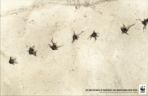 WWF: безответственная вырубка деревьев - след от автоматной очереди на теле нашей планетыЛесной попечительский совет (FSC, Forest Stewardship Council) - международное некоммерческое объединение, призванное поощрять ведение экологически ответственного, социально ориентированного и экономически эффективного лесного хозяйства. Маркировка FSC на древесине означает, что ее производство полностью удовлетворяет принципам и критериям, разработанным FSC. Поэтому Всемирный Фонд Дикой Природы (WWF) призывает приобретать только древесину, отмеченную таким лейблом.250 000 гектаров тропического леса вырубаются каждую неделю. Сохрани леса, покупая только древесину, отмеченную лейблом FSC." Агентство: Publicis Conseil, Париж, Франция Творческий директор: Olivier Altmann Арт директор: Reza Behnam Копирайтер: Reza Behnam Фотограф: Vincent Dixon Ретушь: Studio Kilato Арт-байер: Flore Silberfeld Главный аккаунт-менеджер: Sandrine Bissoulet |
