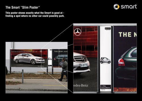 Smart - помещается вездеРекламный постер автомобиля Smart, благодаря трудам агентства Jung von Matt, наглядно показывает потребителю основную особенность этого автомобиля. А именно: компактные размеры и возможность легко найти место для парковки в переполненном машинами мегаполисе.Помещается везде Агентство: Jung von Matt, Zurich, Switzerland Арт директор: Hisham Kharma Копирайтер: Sergio Penzo |