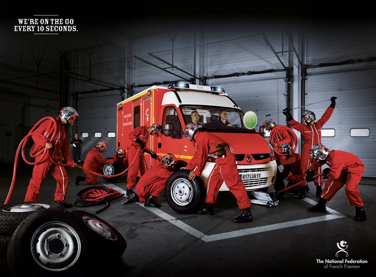 Французские пожарные словно автогонщики: делают пит-стопы всего на 10 секундЭтот плакат создан рекламным агентством Euro RSCG C&O по заказу Национальной Федерации Французских Пожарных (The National Federation of French Firemen), которые, как следует из принта, принимают вызовы каждые 10 секунд и собираются так быстро, словно они участвуют в автогонке.Мы собираемся в путь каждые 10 секунд. Агентство: Euro RSCG C&O, Париж, Франция Творческий директор: Olivier Moulierac, Jerome Galinha Арт директор: Luc Braquet Копирайтер: Luc Braquet, Bruno Banaszuk, Thierry Chantier Фотограф: S.Gautier, P.Forget Другое: Albano Martins |