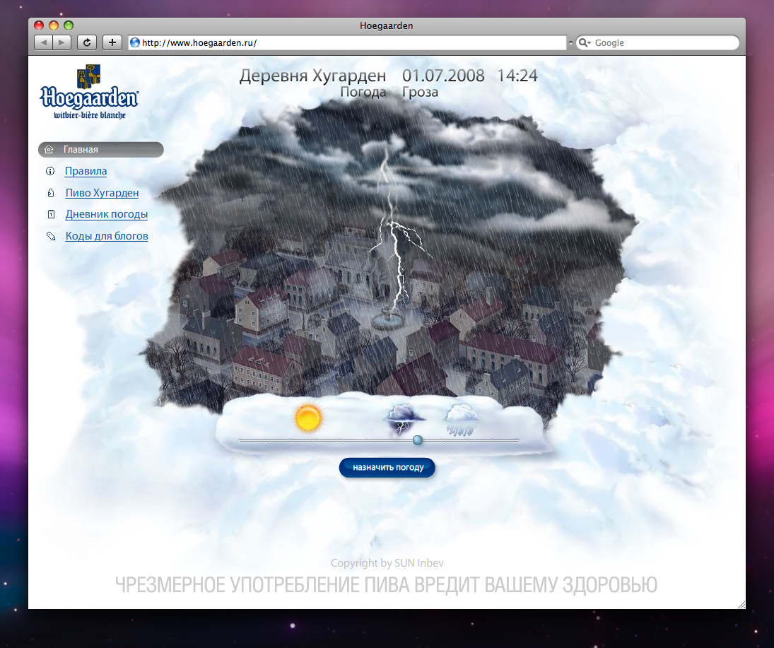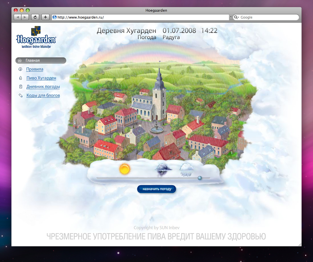 Продвигая Hoegaarden, о пиве практически не говорятНа сайте представлена виртуальная деревня Хугарден, погоду в которой назначают сами интернет-пользователи.Пивные бренды, как рекламируемый продукт, диктуют определенные условия при разработке рекламных активностей, стратегий и создании рекламных концепций. Акции нередко похожи одна на другую, как внешне похожи две капли самого пива. При разработке рекламной акции в сети Интернет для бренда Hoegaarden перед агентством AdWatch стояла задача создать нестандартную концепцию продвижения продукта, которая отражала бы подчеркнуто гармоничный характер бренда и отличалась от привычных рекламных ходов в этом сегменте. Таким образом, задача была осложнена необычным для пива позиционированием самой марки и поиском уникального решения. Креативная концепция кампании, предложенная AdWatch, была построена на гармоничном восприятии окружающей действительности. Каждый пользователь выбирает погоду в зависимости от того, какому состоянию стихии соответствует его настроение и самочувствие - хмурым тучам, моросящему дождю, радуге или ясному солнечному дню. Основываясь на заданных тысячами пользователей параметрах погоды, механизм сайта рассчитывает усредненные погодные условия для всех участников проекта и отображает "Погоду в сети Интернет". В результате проекта, рассчитанного на полтора месяца, сайт hoegaarden.ru соберет уникальную статистику о ежедневном изменении настроения пользователей интернета. "Особенностью этого проекта является то, что, продвигая пивной бренд, мы практически не говорим о самом пиве! Мы не призываем собирать бутылки, крышки и этикетки. Вместо этого, мы аллегорически передаем пользователю гамму ощущений и эмоций, которые несет в себе светлое нефильтрованное пиво Hoegaarden" - отметил креативный директор AdWatch Дмитрий Смирнов. Проект сопровождается рекламной кампанией в интернете, которую также спланировало и осуществляет AdWatch. В течение полутора месяцев реклама Hoegaarden будет размещаться на крупнейших порталах Рунета Mail.ru и Yandex (в разделах прогноза погоды), в блогах, а также на новостных и lifestyle-ресурсах. Разработанные для кампании интерактивные баннеры автоматически получают информацию с сайта hoegaarden.ru и отображают заданное пользователями состояние погоды в сети в текущий момент. Состав творческой группы Екатерина Полякова - pуководитель группы менеджеров, AdWatch Дмитрий Смирнов - креативный директор, AdWatch Максим Бобров - арт-директор, AdWatch Максим Сивоконь - руководитель веб-разработки, AdWatch Анастасия Баранова - генеральный продюсер, AdWatch Наталья Гришкина - руководитель отдела специальных проектов, AdWatch Наталья Грубич - медиапланнер, AdWatch Инна Походня - менеджер группы лицензионных и импортных брендов, Sun InBev Татьяна Медведева - бренд-менеджер Stella Artois & Hoegaarden |
